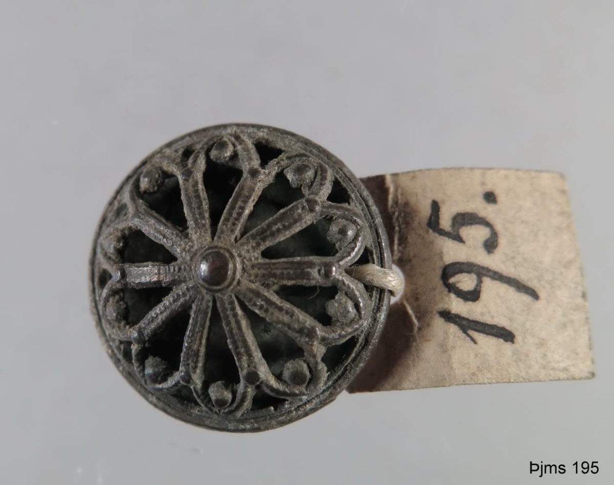 Víravirkisknappur úr kopar. Hann fannst undir skólavörðu grundvellinum 864. 1) 1) Gripir þessir, sem hér eru taldir nr. 195-264, eru auglýstir í Viðaukablaði við Þjóðólf XIV. ár, nr. 9 - 10, bls. 41-44.