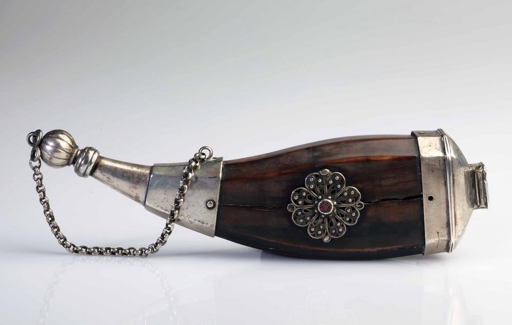 Úr aðfangabók: Tóbaksbaukur (ponta) úr rostungstönn, dökkleitur silfurbúinn, lengd með töpp og tappa 19 cm, mesta breidd 5,1 cm og mesta þykkt 3,5 cm (um rósirnar). Hann er af venjulegri lögun og með brúnaflötum. Á miðjum hliðum eru 8 - blaðaðar víravirkisrósir úr silfri og ,,steinn" í miðju úr rauðu, glæju gleri. Stúturinn er ógrafinn, en í kringum opið er renndur kragi. Á tappanum er fjöður, sem festir hann í stútnum, en efst er hnúður, sem er eins og hýdd appelsína á að sjá. Tappinn er festur við pontuna með silfurkeðju. Töppin er ferskeytt og á lokið eru grafnir stafirnir JJ, sem eru upphafsstafir Jóns Jónssonar í Purkey, en áður hafði átt pontuna Hafliði Eyjólfsson í Svefneyjum. Rétt ofan við keng þann, sem festir tappakeðjuna við pontuna er stimpillinn RS. þ.e. Rögnvaldur Sigmundsson í Fagradal (d. 1871). Silfur í Þjóðminjasafni: Tóbakspontan er frá 19. öld. (sbl. 2.11.2010) Á minjaslóð: Tóbakspontan er einn vandaðasti gripur Rögnvaldar. Rostungstönnin, sem er uppistaðan í pontunni, er mjög dökk sem bendir til þess að tönnin hefur legið lengi í jörðu. (sbl, 15.12.2010)