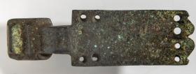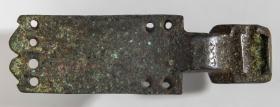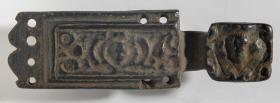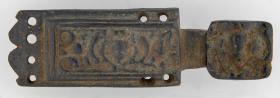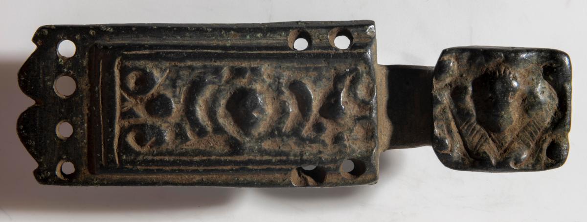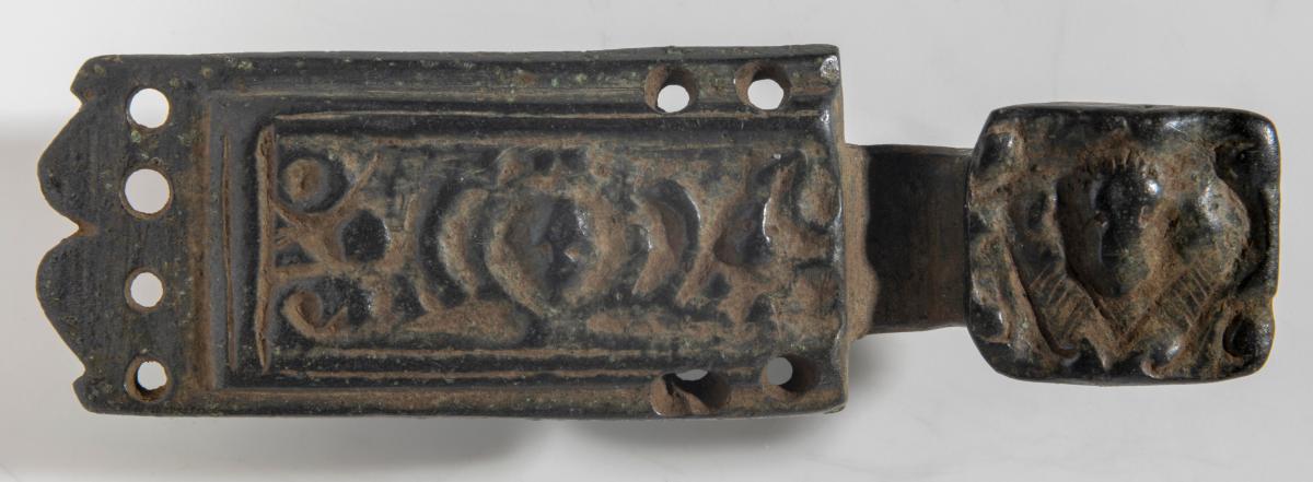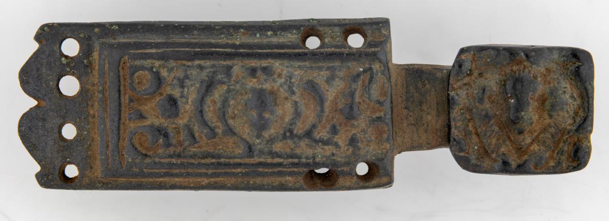 Krókstokkur úr kopar, steyptur, af belti eða úr hempupari: á honum eru mótuð englahöfuð. Fundinn í gömlum öskuhaugi.