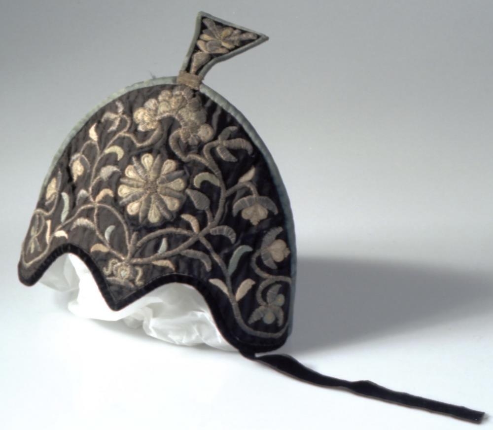 Spaðahúfa, öll baldíruð að framan með hvítum og gylltum silfurvír, og alla vega litum silkitvinna. Hún er frá Hrappsey, en er gjör af dætrum Skúla Magnússonar landfógeta. Slíkar húfur voru mjög tíðkaðar á stúlkubörnum á síðara hluta átjándu aldar, en þó varla fyrr, því að spaðafaldurinn eða breiði faldurinn, sem þá var kallaður svo, gagnstætt þeim sívala trafafaldi, er áður hafði tíðkazt, var eigi þekktur fyr en um 1765, en spaðinn á húfum þessum er auðsjáanlega í líkíngu þess falds. Áður höfðu stúlkubörn skarðhúfur, sem voru eins, nema hvað þær höfðu knapp (opt stóran silfurknapp) í kollinum. Þessar húfur eru þó fráleitt eldri en frá því seint (?) á sextándu öld, því að þá hafði fullorðið kvennfólk mjög líkar húfur og í útlöndum.