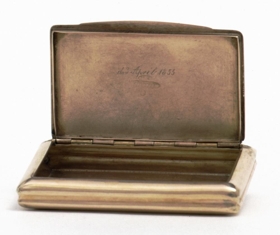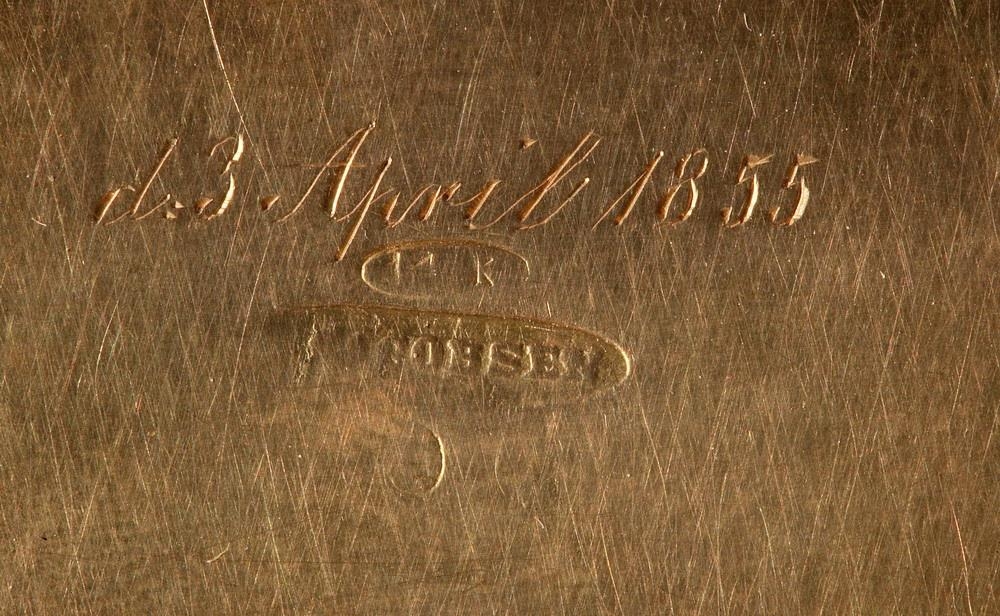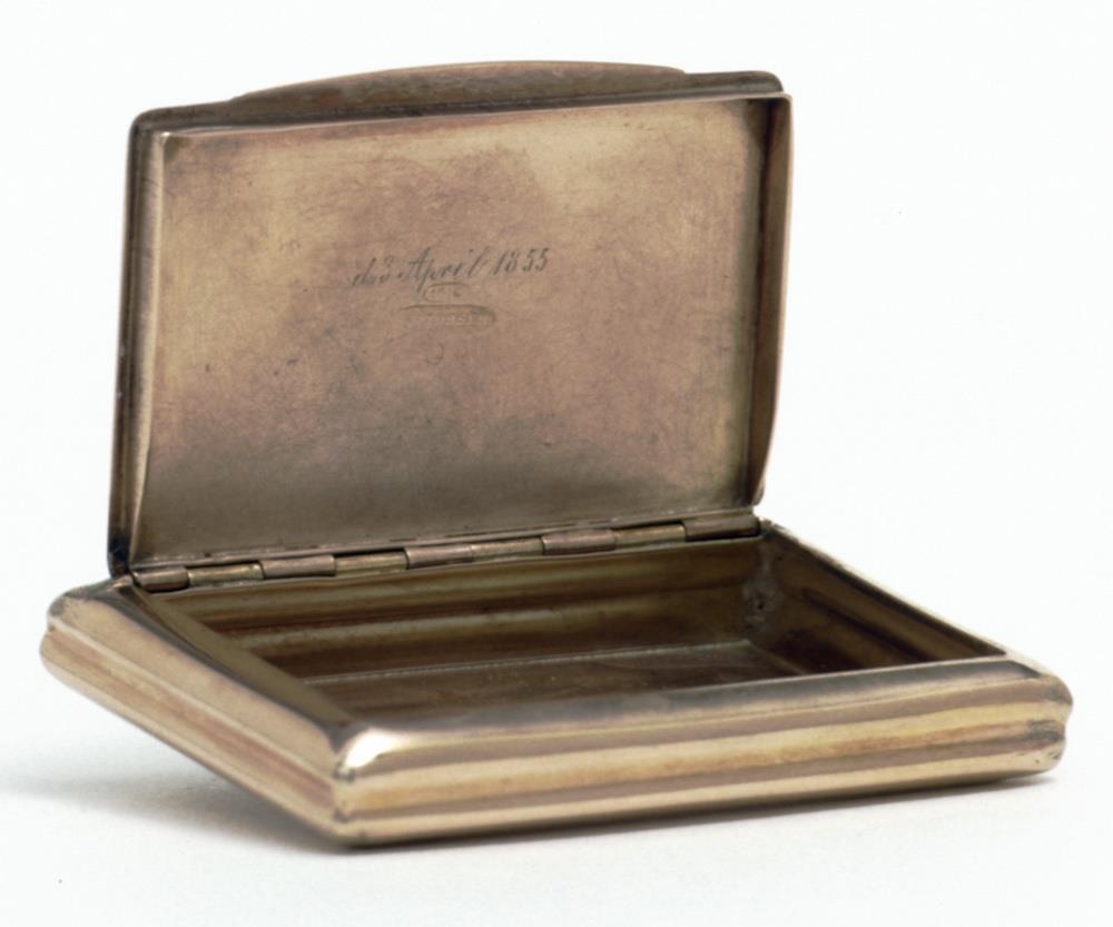 Gullneftóbaksdósir með loki. Að lögun eru þær líkt og þunnur kassi og lokið leikur á hjörum. Lokið er ekki jafnstórt yfirborði dósanna þannig að 1/2 cm breiður kantur er í kringum lokið. Innan á lokinu er grafin áletrun: d.3.April 1855. Þá er einnig grafinn stimpill gullsmiðsins: Jacobsen.