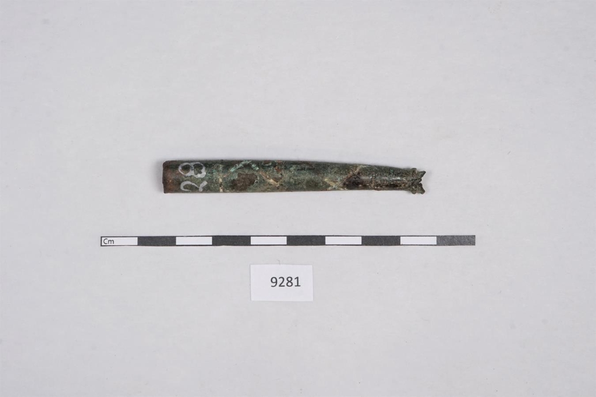 Skapt af al eða bor, sting eða stýl, úr kopar, en járn er innaní að endilöngu, 6,6 að l., 5-9 mm. að þverm., ávalt og mjórra í annan endann, og af þeim endanum hefur brotnað. Það er með rákum um, sem mynda rúður eða tigla, og hefur verið felt eða rennt í rákirnar einhverju, sem er mú hvítt. Fannst í norðausturjaðri öskunnar á s. st. og nr. 9278-80.