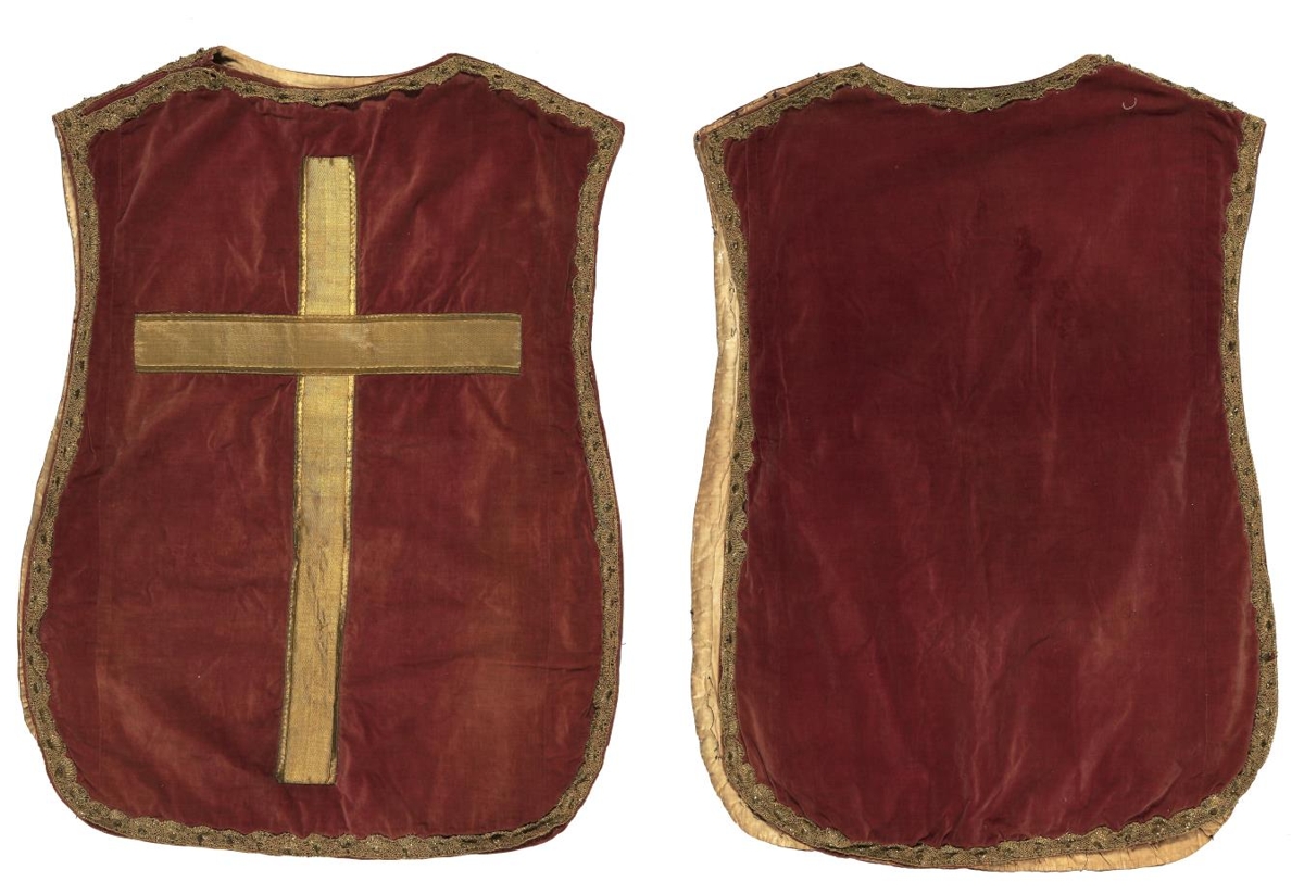 Hökullinn er úr rauðu flaueli með gullborðakrossi og gullvírskniplingum við jaðra. Guðmundur Óli Ólafsson sóknarprestur í Skálholti afhenti Þjms. hökulinn til varðveislu 17.10.1995.