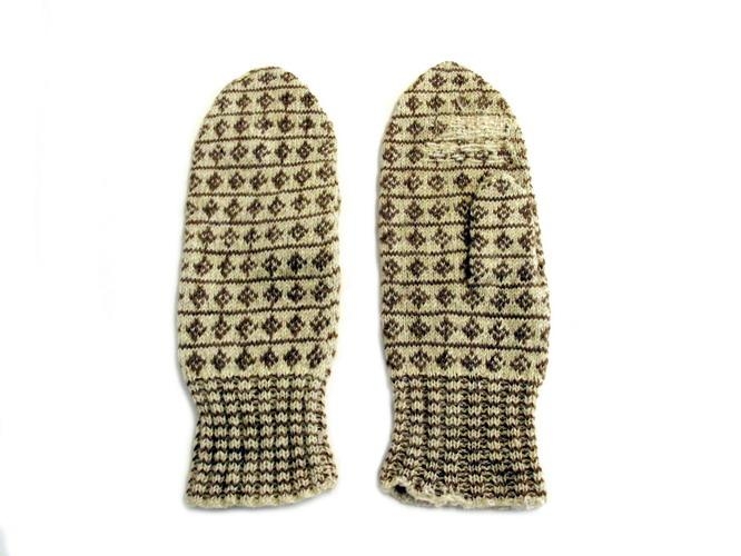 tvíbanda vettlingar úr heimaunnu bandi. Brugðningin er röndótt, en