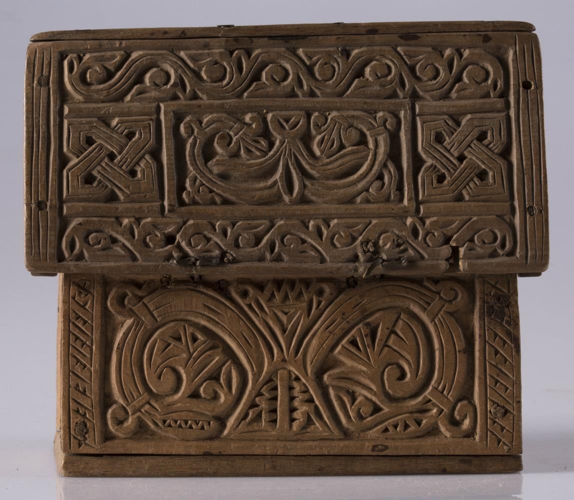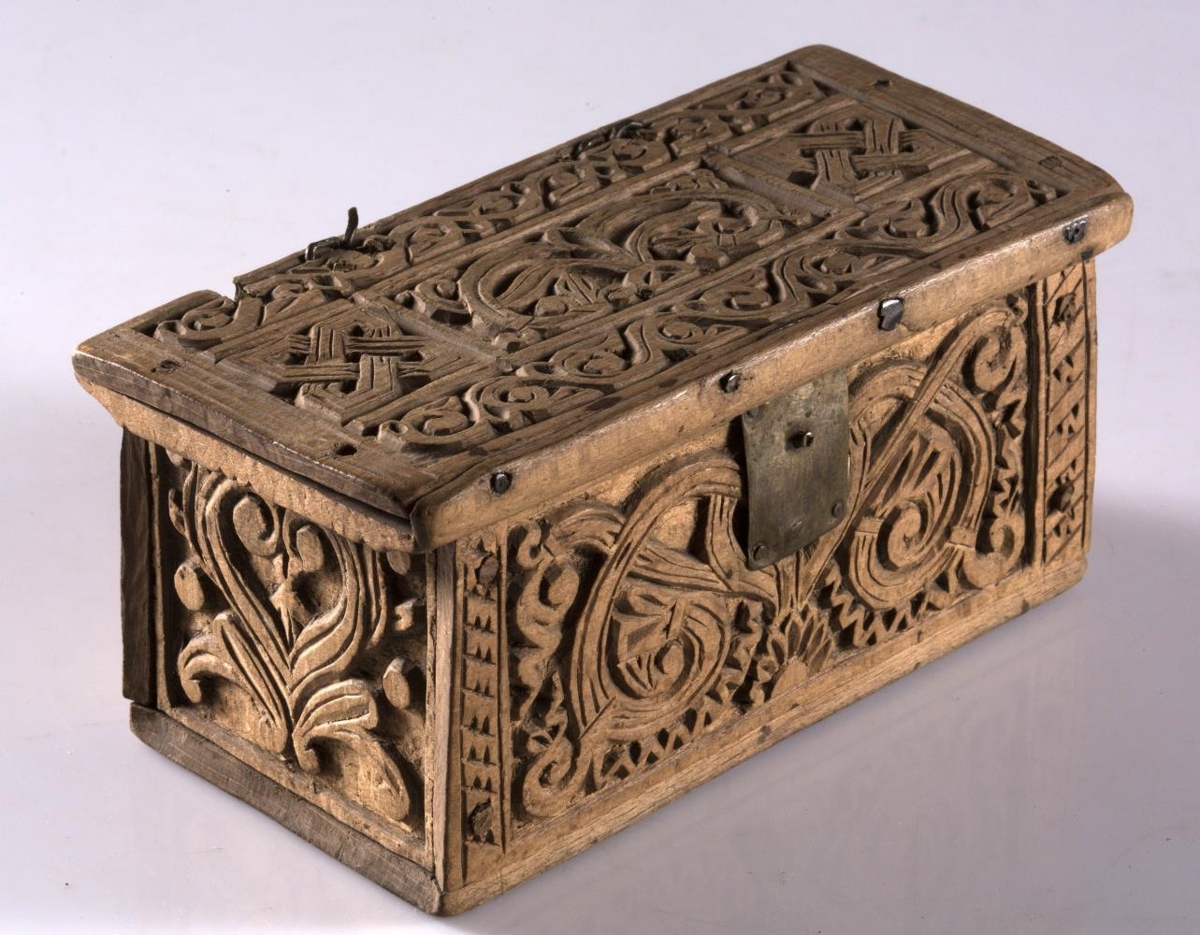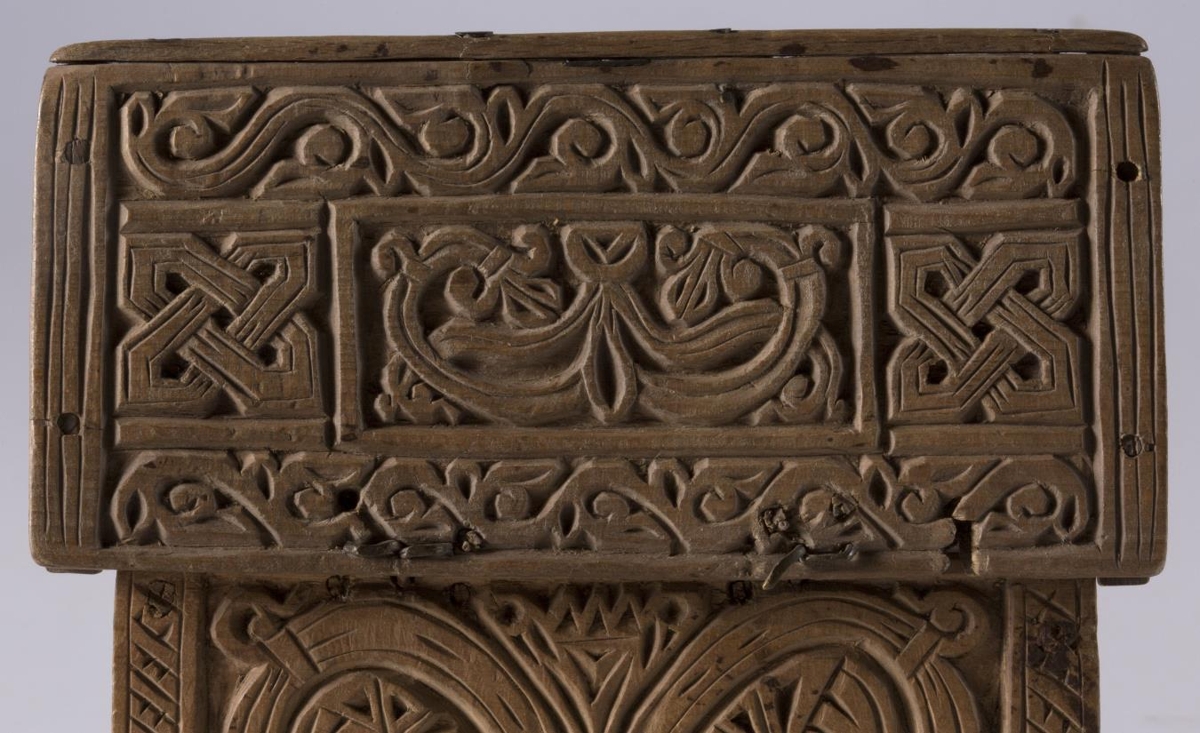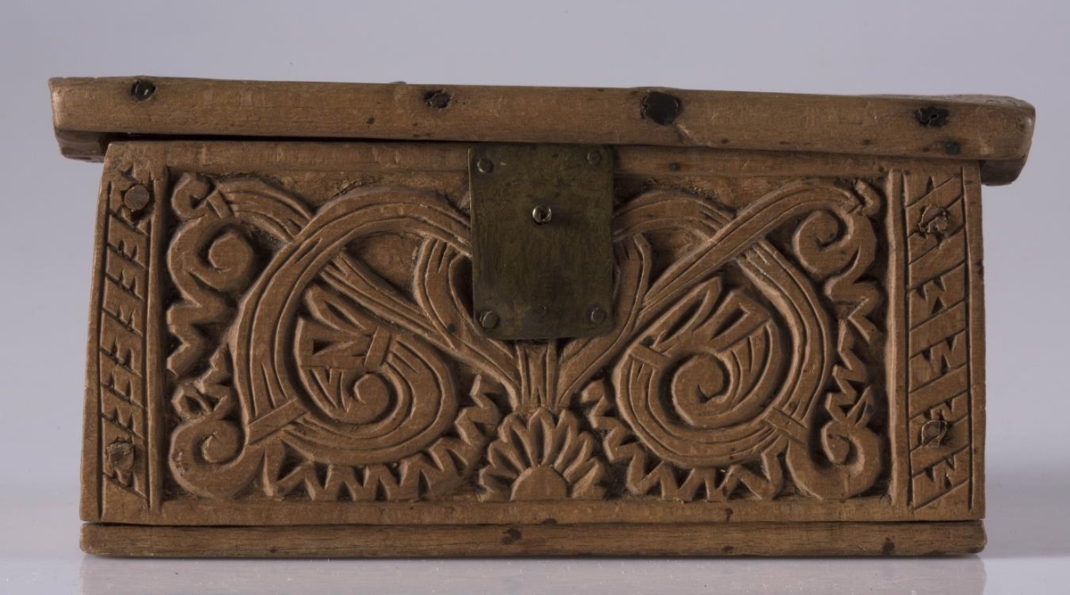 útskorinn með greinum og hnútum í íslenzkum stíl. Eins konar látúnslæsing