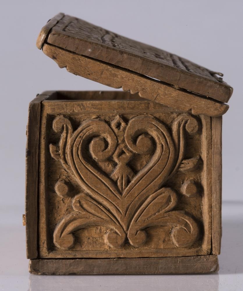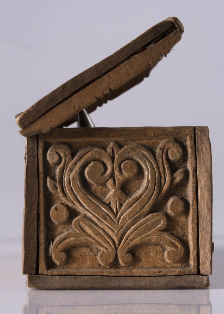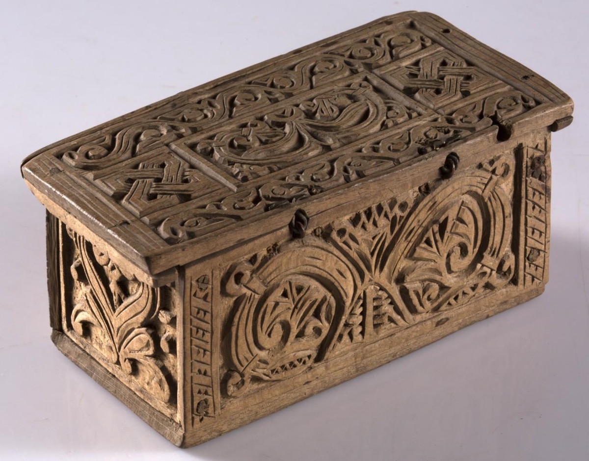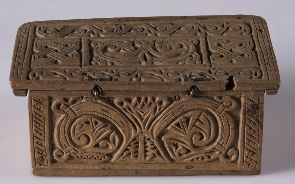 negldur saman með trjenöglum: l. 14,8 cm.,b. 8 og h. með loki 7,5 cm. Í