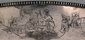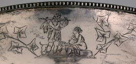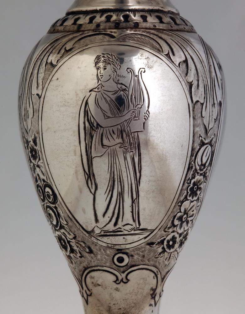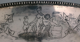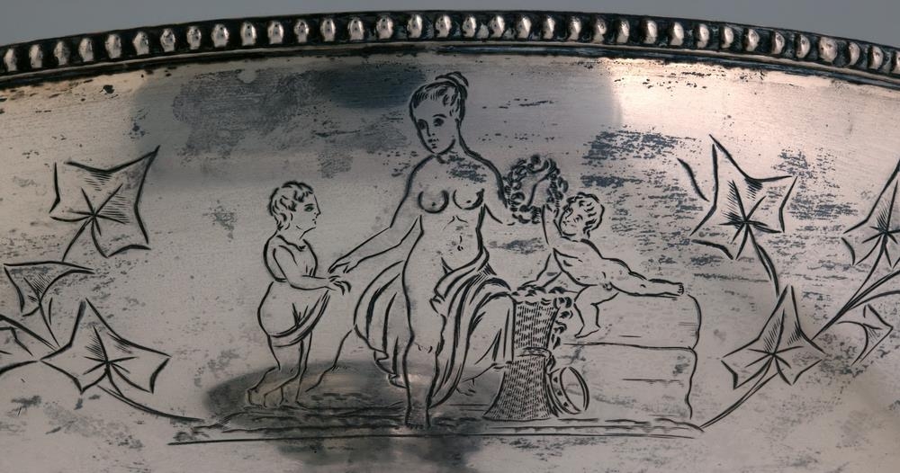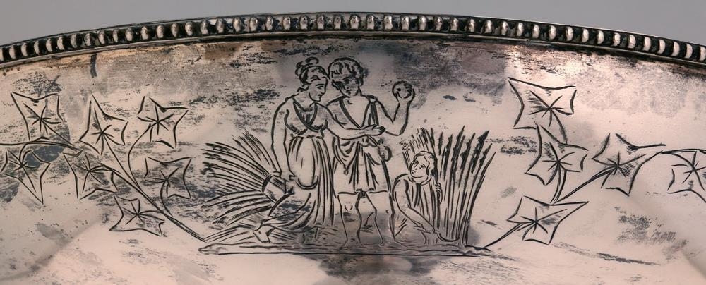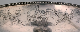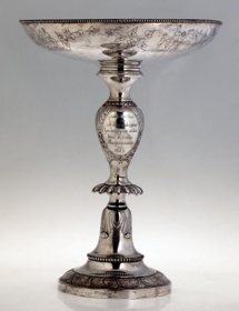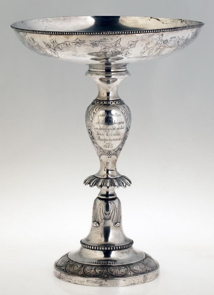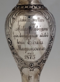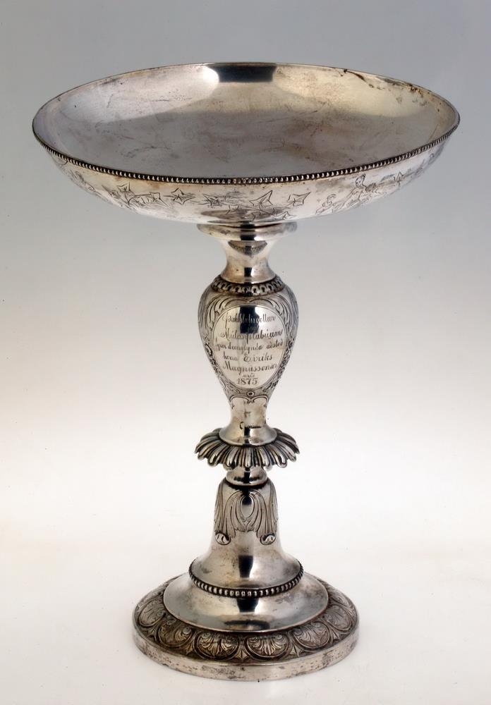 Silfurskál á háum fæti, ætluð til að standa á stofuborði, gerð fyrir ávexti eða nafnspjöld eða önnur smáspjöld. H. 41 cm., þverm. skálarinnar 30,7 cm., stjettar 17,4: fóturinn með skorum og útskotum, mjög misgildur, allur skrautlega drifinn og grafinn. Neðaná skálina eru grafnar árstíðamyndir Bertels Thorvaldsens og vafningsviðarblöð á milli, en á bumbu á leggnum eru grafnar myndir af Apolló og Aþenu, og þessi áletrun, á 3. sporöskjulagaða fletinum: Þakklætisvottur frá Múlasýslubúum fyrir drenglynda aðstoð herra Eiríks Magnússonar árið 1875. Þegar Múlasýslubúar biðu hið mikla tjón af eldgosunum úr Dyngjufjöllum 1875 gekkst E.M. fyrir mikill fjársöfnun í Englandi til styrktar þeim, um 40,000 kr.: var keypt fóðurkorn fyrir og sent gufuskip til Austfjarða með það: gerði E.M. það sjálfur og kom sjálfur með skipinu. Sjá Frjettir frá Íslandi 1875, bls. 14 - 15. - Neðaná skálinni og neðaná stjettinni eru 4 stimplar, smiðsins, IACOBSEN, þ. Ásbjörn gullsmiður Jacobsen, íslenzkur, merki Kaupmannahafnar með 77 og sjerstakur stimpill með sama ártali, 77, og loks myntvarðarstimpillinn. - Skálin er vandaður og dýrmætur gripur.