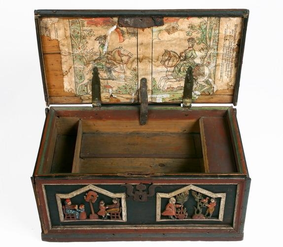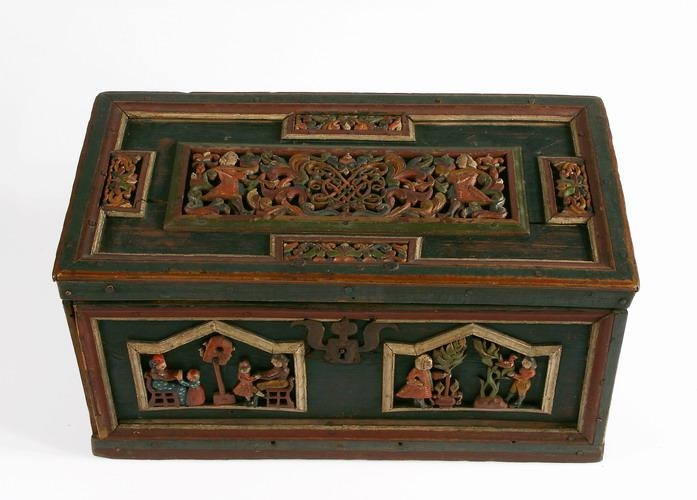 Kistill úr furu l. 50, br. 26 og h. 25,5 cm. Undir botninum eða á milli botna er skúffa, dregin út úr framhliðinni, dýpt 3 cm. Í kistlinum eru 3 handraðar, 1 við hvorn enda og 1 við apturhlið og undir hinum. Á framhliðina, gaflana og lokið eru negldir strikaðir listar, málaðir blágrænir, rauðbrúnir og hvítir, en grunnfletirnir fyrir innan eru svartir. Bakhlið er sljett, málað rauðbrún. Á framhlið, gafla og hlið eru negldar gagnskornar og útskornar fjalir, skrautlega málaðar með ýmsum litum. Á lokinu miðju er ferhyrnd fjöl, 33 x 11,5 cm., og eru í henni miðri upphafsstafirnir SJJ skornir á ská rjett og öfugt, en greinar beggja vegna og sinn maðurinn hvoru megin: eru þeir í rauðum kjól (rokk), með hvíta hárkollu: vesti blá, sokkar brúnir og stígvjel svört. Umhverfis þessa fjöl eru 4 smáfjalir með marglitu blómskrauti, sín við hvorn gafl og hvora hlið. Utan á göflunum eru marglit blóm, sitt á hvorum, og 2 fuglar í hvoru. Á framhlið eru 2 hópmyndir, sín hvoru megin við miðjuna. Þær eru ferhyrndar, l. 16,2 og h. 10 cm., og burst á miðju. Sjálfar myndirnar eru marglitar en hvítir, strikaðir listar eru um þær. Á annari er á miðju stólpi með fuglabúri og 4 fuglum í, en annars vegar við það situr kona á stól með smástúlku fyrir framan sig 1), en hins vegar situr maður með dreng fyrir framan sig. Konan er í rauðbrúnni treyju með grænum dröfnum og bláleitu fati með hvítum dröfnum: líkur litur er og á treyju stúlkunnar, en fat hennar er rautt: báðar hafa þær eitthvað rautt skraut uppúr höfðinu og virðist hárið vera uppsett. Maðurinn er með svarta húfu á höfði: hann er á rauðri peisu með svörtum dröfnum og er hún girt ofan í buxurnar, sem eru gular: sokkar eru bláleitir og stígvel svört. Drengurinn er í síðum kjól, rauðum, gulum buxum, hvítum sokkum, svörtum skóm og rauða húfu með svartri gjörð. - Á hinni myndinni eru 2 menn og trje fyrir framan þá: snú hvor að öðrum en bil er á milli. Annar er líkt klæddur og mennirnir á lokinu, kjóllinn eins, en vesti er grænt og sokkar bláir. Trjeð fyrir framan hann stendur í brúnu blómkeri og heldur hann vinstri hendi um trjeð en hefur hina í vasa, sem er utaná kjólnum. hinn maðurinn er rauðri peisu, gulum buxum, bláum sokkum og með svarta stigvjelaskó. Fuglar í trjenu fyrir framan hann. - Búningar þessir allir eru líkir. þeim er tíðkuðust á fyrri hluta 18. aldar.- Kistillinn er læstur og er jarnlauf fyrir skráargatinu með stórum blöðum uppaf. Hann er svo líkur kistlunum nr. 867 og 901 að ætla má að sami maður hafi smíðað þá alla. En Sigurður málari Guðmundsson kvað nr. 901 vera eptir Hallgrím bónda Jónsson, sem var smiður góður, faðir Þorláks dannebrogsmanns í Skriðu og Gunnars prests í Laufási, föður sjera Gunnars þar yngra, föður Tryggva bandastjóra 2). - Innan á lokið hefur verið límt, undir lamir, sem eru úr látúni, og læsingarjárn, prentað blað með myndum af Friðriki konungi 5 og Lovísu drotningu hans, eru nöfn þeirra og titlar fyrir neðan, en hafa raunar verið skorin af og fest til hliða útvið okana. Myndirnar eru prýddar grænum og rauðum litum. Ætlast er til að þær megi klippa hvora frá annari og setja hvora í sína umgjörð. Konungshjónin eru bæði á reið og I sin fagt-Habit. Myndirnar eru prentaðar í Kaupmannahöfn, en ártal er ekki á þeim: findes til kiÝbs i Skinder- Gaden lige over for nor Frue-skole-Um slík kistubrjef í Svíaríki sjá nú Nord. Mus. ock Skansens årsbok 1934, bls. 83 - 100. 1) Á Ósi í Breiðdal sá jeg líkan kistil 1915.