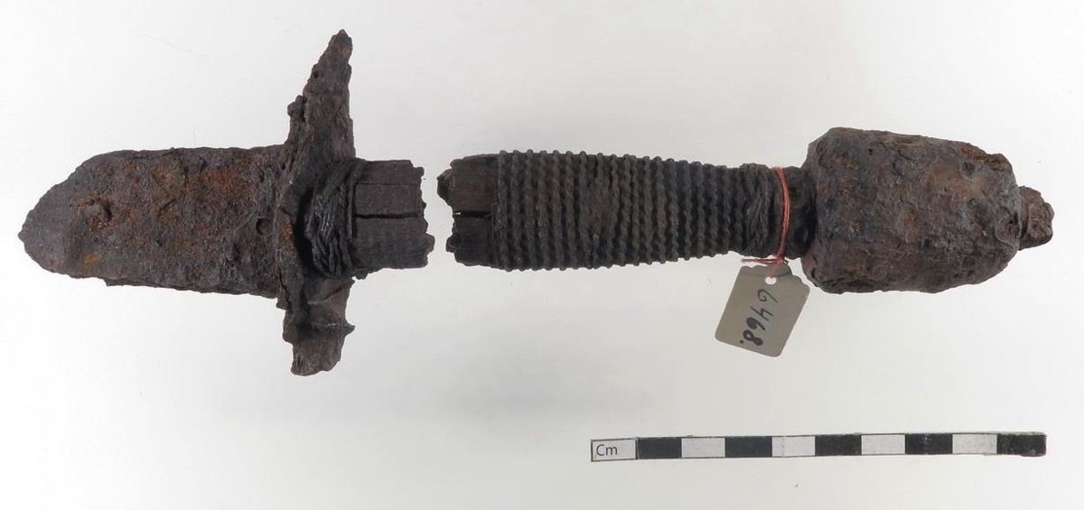 Sverðsleifar mjög ryðbrunnar: eru það hjöltun og efsti hluti blaðsins, 6,3 cm.: 1) virðist sverðið hafa verið eineggjað og er blaðbúturinn með rákum við bakkann og um 3,3 cm. að breidd. Meðalkaflinn er um 10 cm. að lengd, brotinn sundur nú, vafinn messingarræmu og vír: efra hjaltið er 4 cm. langur hnúður úr járni: hið neðra virðist hafa verið með handbjörg. Líklega frá Sturlungaöldinni. - Fundust í moldarflagi hjá Stóra - Kroppi. 1) 15/12 1920 komu 2 bútar af blaðinu í viðbót, fundnir á sama stað og hjöltun. Sbr. brjef Kr. Þ. og skýrslu 6. - 7. XII. '20.