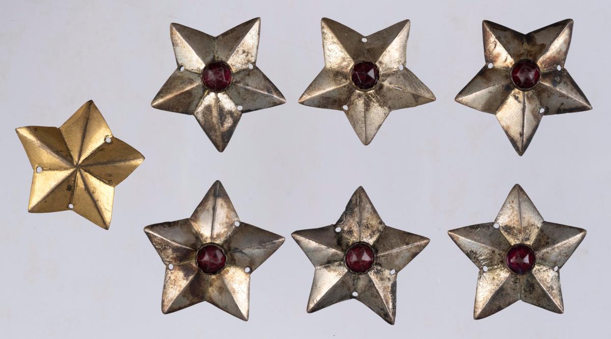 2.8 sm. Greyptur rauður steinn á sex þeirra og h. mest 0.7 sm, grár blær