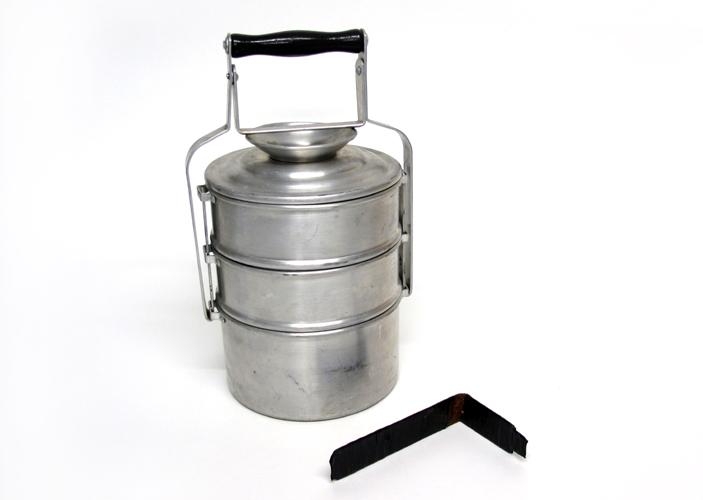 Nestisbox úr áli (í laginu eins og svokölluð engjaspenna). Þetta eru í raun þrjár skálar sem staflast hver ofaná aðra og svo er spenna með svörtu tréhaldi efst sem heldur skálunum föstum saman. Ofan á efstu skálinni er lok úr sama efni. Þetta er væntanlega einnig hugsað sem pottasett fyrir prímus því að með fylgir halda úr járni sem hægt er að krækja undir eyru á skálunum eða pottunum til að forðast það að brenna sig þegar pottarnir eru heitir. Um þessa höldu hefur verið vafið svörtu límbandi, væntanlega til enn frekari einangrunar.