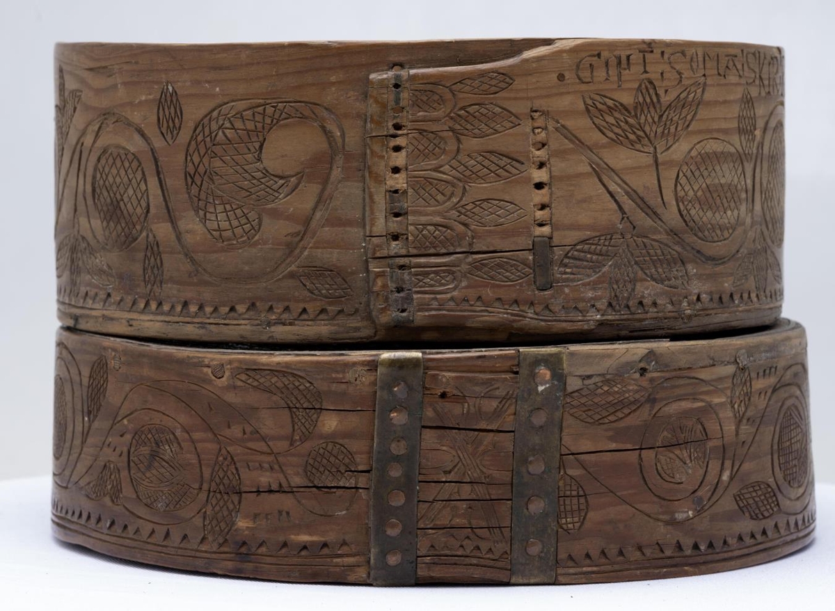 Trafaöskjur með höfðaletri á loki, sem svo heldur áfram umhverfis neðri öskjuna með latínuletri. Fljótt á litið virðist eiga að lesa svo úr þessu: heill fai/nad nai/nipt bloma/gipt soma/skir rosa/deir drosin/digdug halldi/tigd um alldir.