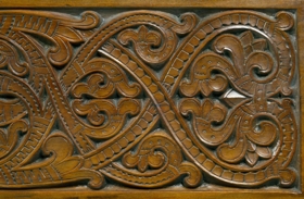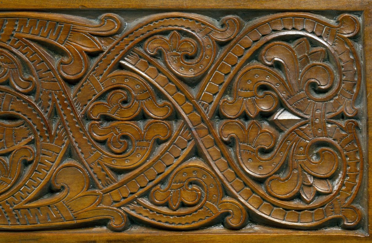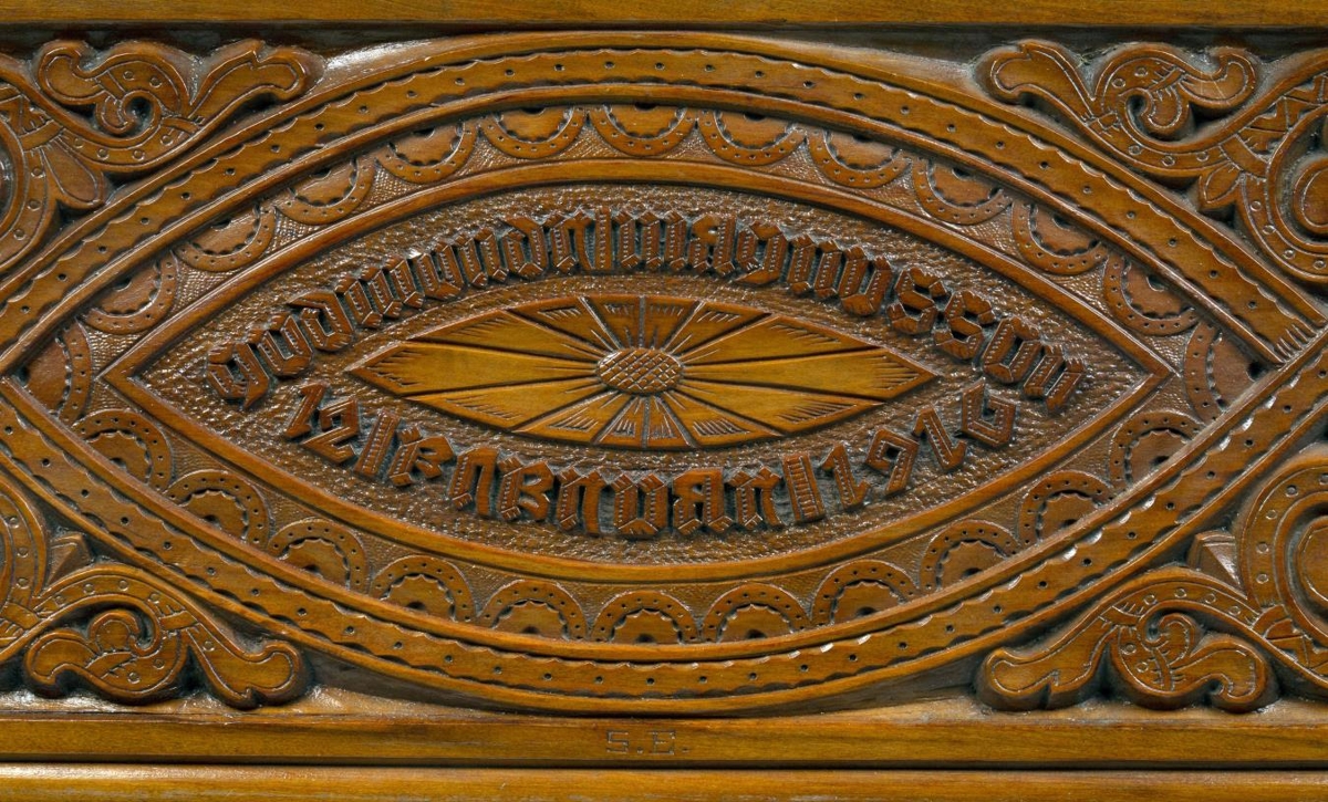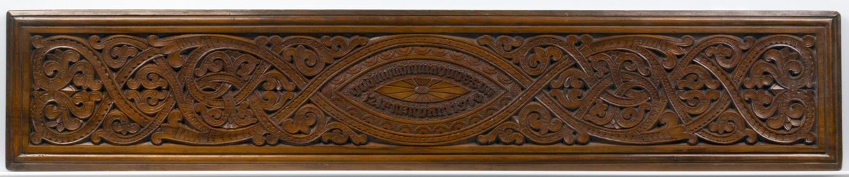 Rúmfjöl ný, úr fíngerðum laufviði, 1,18 cm að l., 23 cm að br., 1,5 cm að þ. Framhliðin öll er útskorin með margbrugðnum blaðastrengjum en strikaðir listar á brúnum. Í miðjunni er reitur, sem á er skorið með höfðaletri: gudmundr magnusson / 12 februar 1916. - Fjölin er skorin af Stefáni Eiríkssyni tréskurðarmeistar og er merkt upphafsstöfum hans: S.E. Mánaðardagurinn er 43. afmælisdagur Guðmundar Magnússonar (Jóns Trausta), skálds og prentara (f. 1873, d. 1918). Sbr. næsta nr.