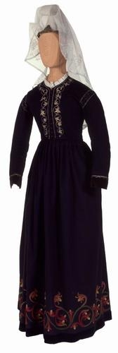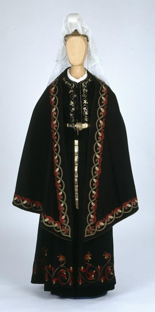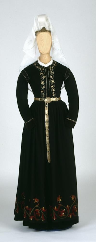 The main components of the skautbúningur are a black broadcloth jacket and skirt. The jacket has gold or silver embroidery, and at the hem of the skirt is an embroidered border. A belt was worn around the waist, usually a pendant belt. A low, white headdress shaped somewhat like a Phrygian cap, skautafaldur, is worn on the head with a veil and headdress bow of the same colour. A gilded fillet was worn with the headdress. The costume was sometimes worn with a long cloak, möttull. Sigurður also designed a simpler, lighter, formal costume, the kirtle, kyrtill, which was worn with the same headdress as the skautbúningur. The costumes designed by Sigurður are still popular today as formal dress. This costume was made by Sigurlaug Gunnarsdóttir of Ás, Hegranes, North Iceland in 1860, following instructions from Sigurður the Painter. The costume is made of black broadcloth, with a simple pattern of foliage embroidered in silver thread on the edges of the jacket, while the skirt hem is embroidered in split stitch with a floral pattern designed by Sigurður, which he called Byzantine. This is the oldest extant skautbúningur known. The headdress fillet is the work of goldsmith Sigurður Vigfússon, later director of the Antiquarian Collection. The belt is by an unknown craftsman.