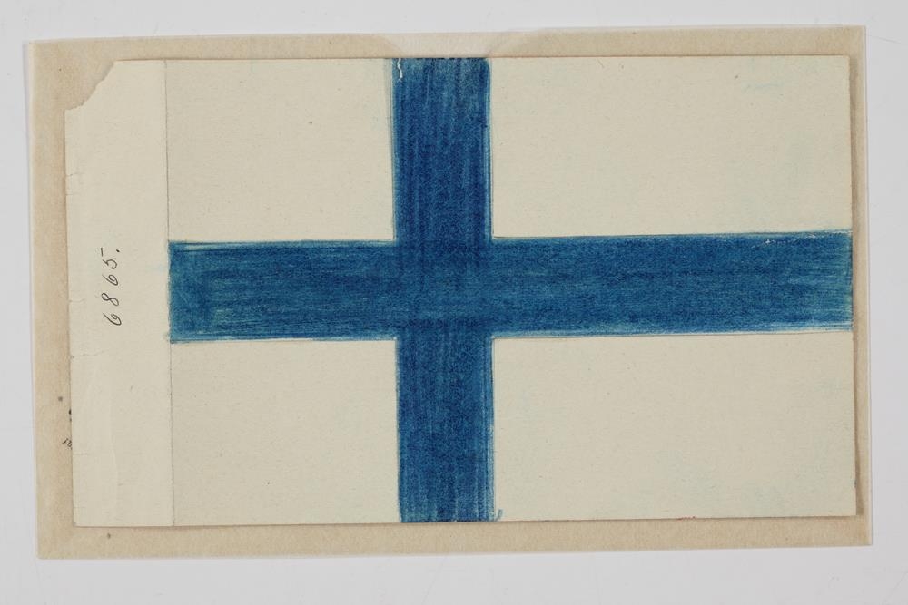 Fánamynd, eins og nr. 6864, nema að því leyti, að skipt er um litina: krossinn blár, en reitirnir hvítir.