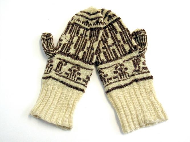 hvítum og brúnum. Stroff er hvítt: frá því að þumli er munsturbekkur og