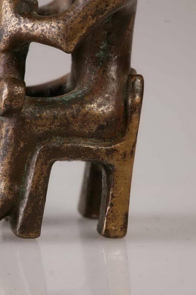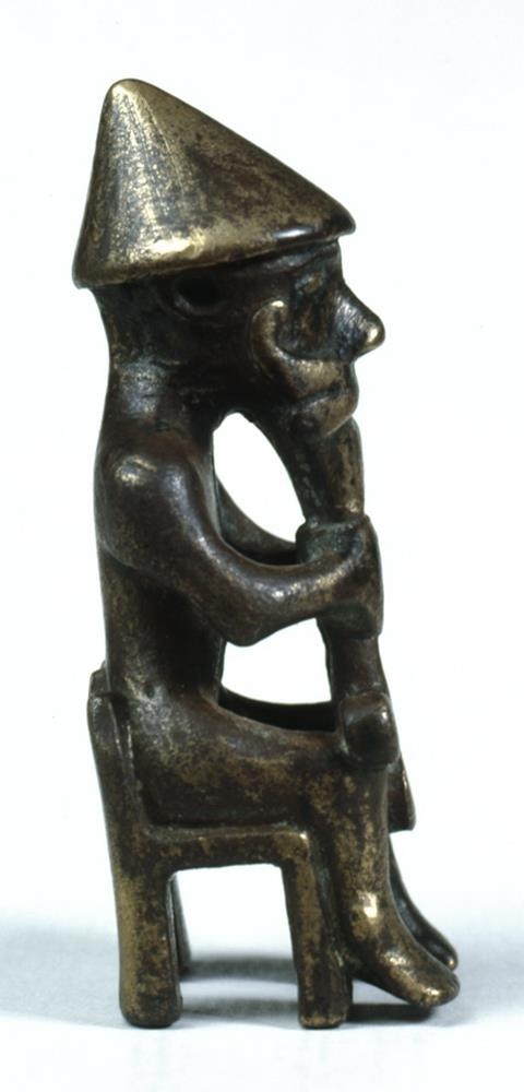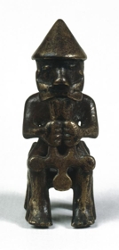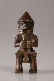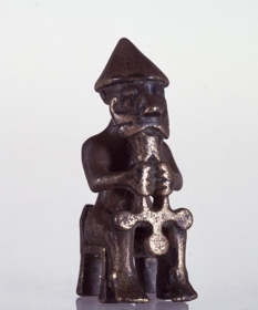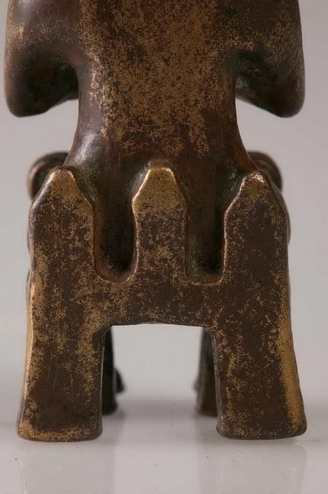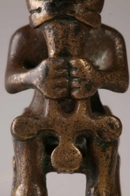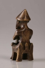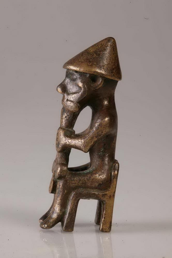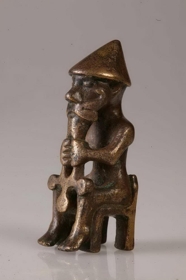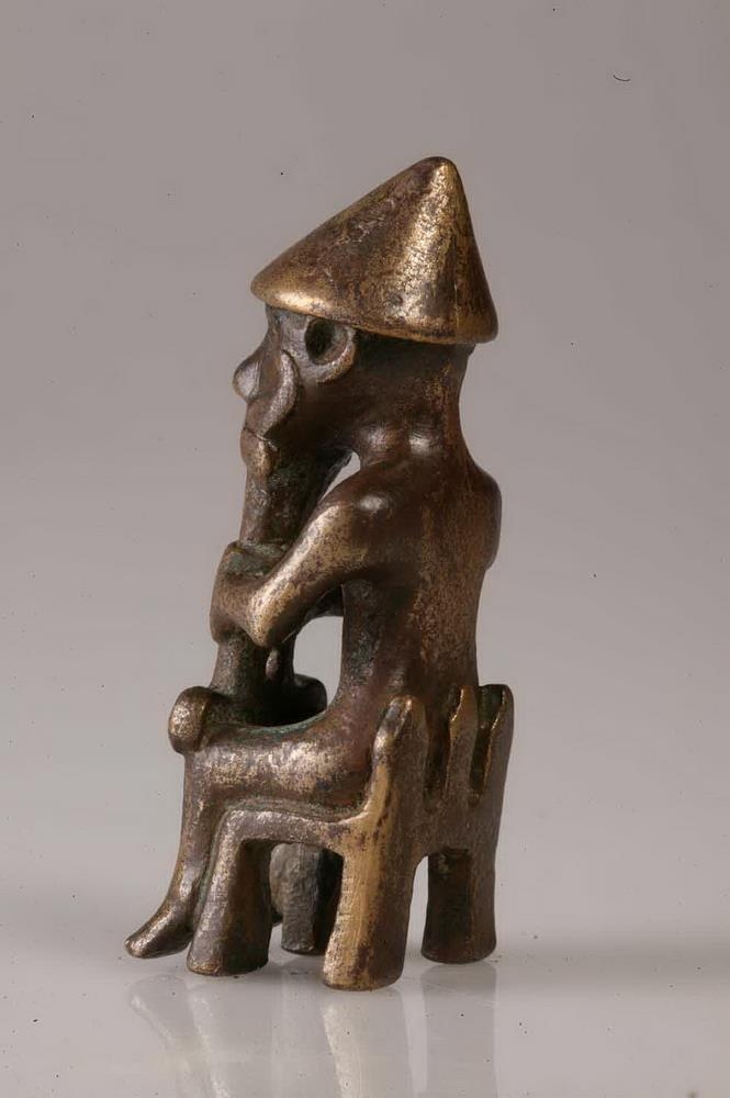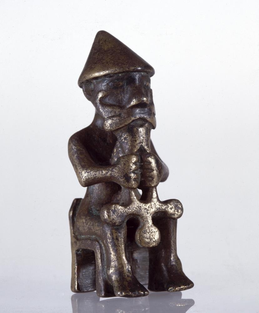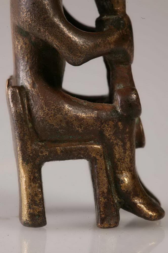 stóli. Bronskarlinn heldur báðum höndum um hlut sem