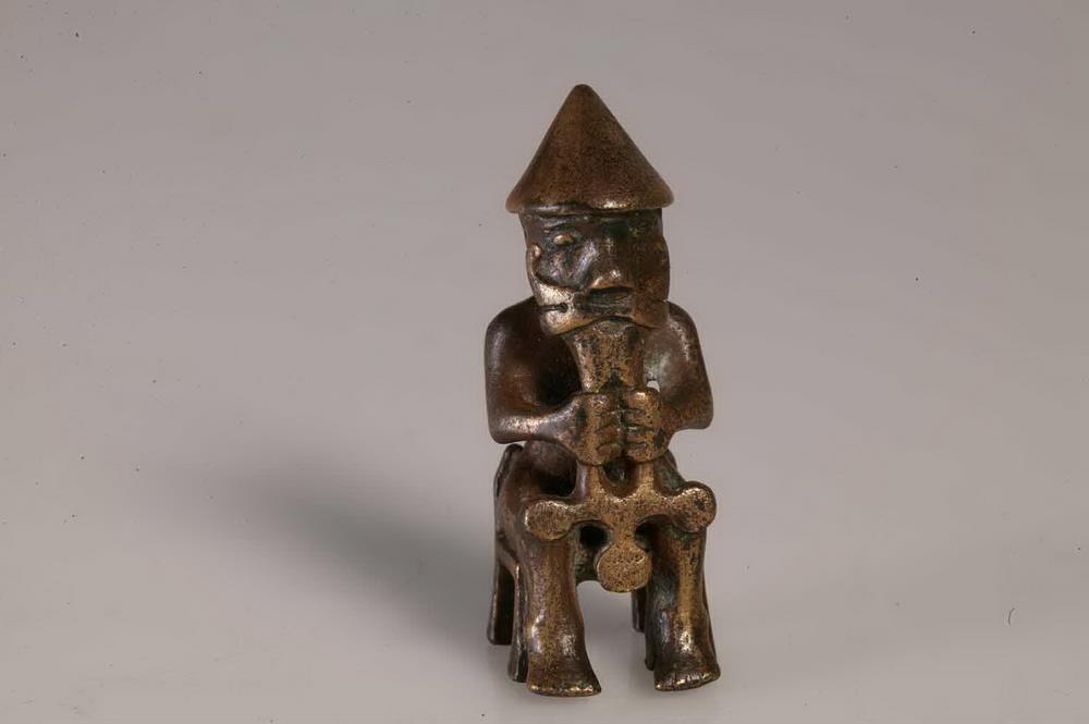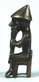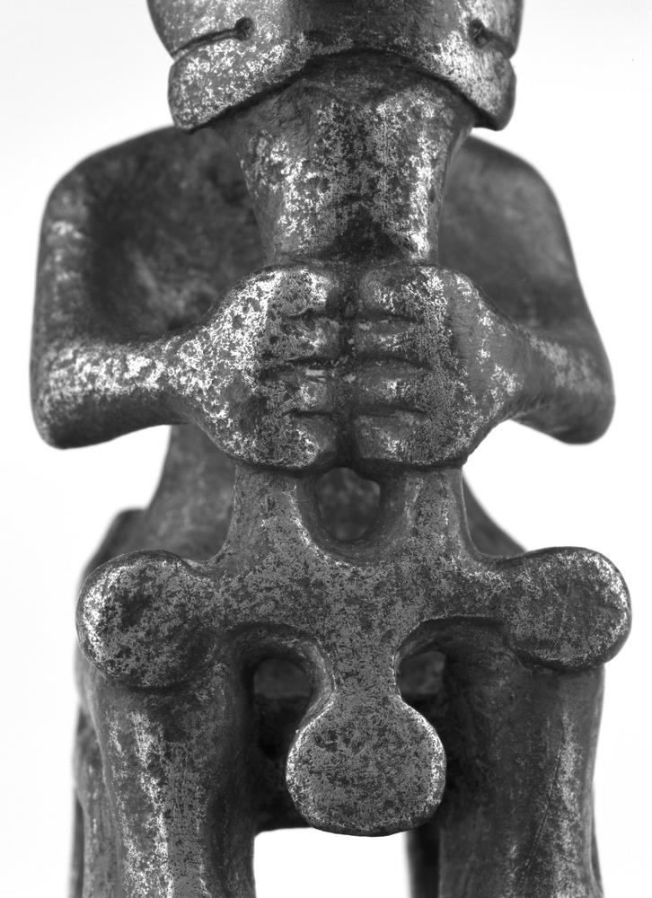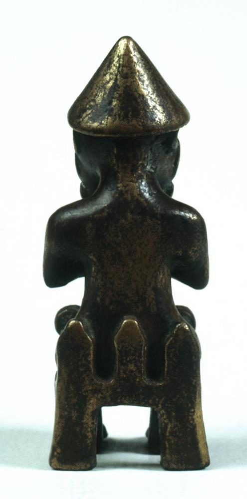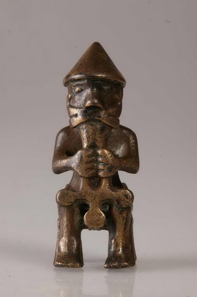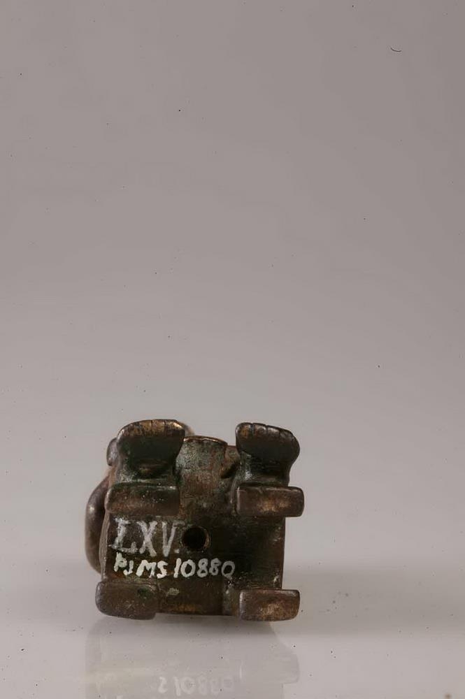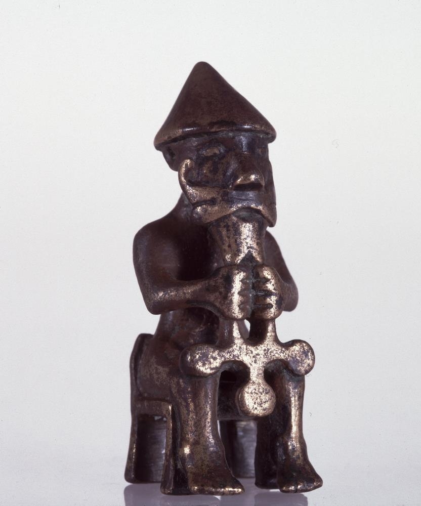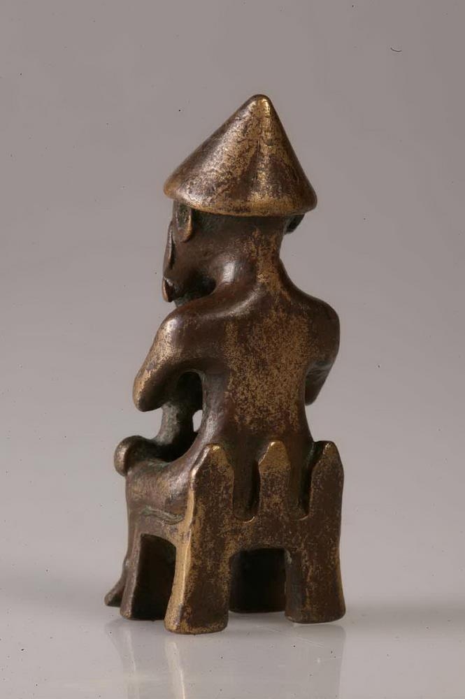 Mannsmynd, steypt úr bronzi; maðurinn situr á stól, sem er á 4 fótum og með baki, er nær þó ekki hærra upp en að bakinu neðst, tæplega upp að mitti. Maðurinn er nakinn að sjá, nema með topphúfu á höfði. Kampar miklir, og tekur maðurinn báðum höndum í hökuskeggið og klýfur það, en fyrir neðan hendurnar kemur það saman aptur og endar í 3 kringlum, sinni á hvoru hnje og einni í milli. Hæðin er alls 6,7 cm. - Fundin rjett hjá bænum á Eyrarlandi 1815 eða 1816 og send Þjóðminjasafninu í Kaupmannahöfn næsta ár, 1817, af J. Gudmand, kaupmanni á Akureyri; kom til safnsins í Nóvember það ár. - Sbr. e.fr. sænska tímaritið Iduna, 8.h., tab. II., 3. mynd. - Þessi gripur og eptirfylgjandi gripir, sem taldir eru komnir þennan dag, voru þá formlega afhentir sem gjöf frá Danmörku til Íslands; var Th. Stauning, forsætisráðherra Dana, afhendandinn fyrir þeirra hönd, las upp við þá athöfn gjafabrjef til forsætisráðherra Íslands fyrir þess hönd, og afhenti honum með því skrá yfir hlutina, sem gefnir voru, en forsætisráðherra afhenti þegar í stað þjóðminjaverði brjefið og skrána, að hann, sem, ásamt sendiherra Dana í Reykjavík, var viðstaddur þessa athöfn, tæki gripina til sín, en þeir voru þá enn í kössum þeim, er þeir höfðu verið sendir í. -Þjóðminjavörður tók síðan hina helztu þeirra upp og hafði um stund til sýnis í Alþingishúsinu, ásamt fleiri minjagripum, er sendir höfðu verið Alþingi vegna þúsund ára minningarhátíðar þess. - Um undanfara þessarar afhendingar, dansk-íslenzka safnamálið, sjá skýrslu þjóðminjavarðar, dags. 22. Febr. 1930, til sendiráðs Íslands í K.-höfn og e. fr. grein hans í Morgunblaðinu 13. júlí s. á. - Lýsingar gripanna hafði hann samið í Höfn snemma á árinu 1918. - Gripirnir eru taldir hjer nær því í sömu röð og í skrá þeirri, er að ofan getur. (Þessi gripur var með tölum. LXV). - Sjá um þennan grip, 10880, Nord Kultur, XXVII. b., bls. 223. - Sbr. e. fr. nr. 6.