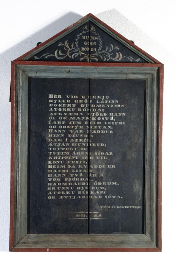 Grafskrift yfir Eggert Guðmundsson, máluð með hvítum, stórum latínustöfum á svartmálað furuspjald. Það er innrammað með strikuðum listum, sem eru grámálaðir nema yzta brúnin, sem er rauð. Upp af rammanum er burst og á bjórinn er málaður hvítur blaðasveigur utan um þessi orð: MINNING GÓÐS BÓNDA. Grafskriftin sjálf er stuðluð og hljóðar þannig: HÉR VIÐ KIRKJU HYLUR GRÖF LÁTINN EGGERT GUÐMUNZSON (stafirnir hallast) ATORKU BÓNDA: AFKVÆMA FJÖLD HANN ÓL OG MANNKOSTI, Í ARF SEM ÞEIM LEIFÐI ORZTÝR MÆTAN. HANN VAR FÆDDUR HINN TÍUNDA DAG Í APRÍL ÁTJÁN HUNDRUÐ: TUTTUGU OG TVEIM ÁRUM SÍÐAR KRISTÍNU SÉR TIL (nafnið skáletrað) KONU FESTI. HEIM ÞÁ KVADDI ER HAFÐI LIFAÐ HANN TVÖ ÁR Á TUG FJÓRÐA, HARMDAUDI ÖÐRUM ER UNNU DYGÐUM, ATORKU BÚSKAPS OG ÆTTJARÐAR SÓMA. TÓMÁS EGGERTSSON 1852 HS Minningartöflu þessa hefur málað séra Helgi Sigurðsson, og eru stafir hans undir. Tvær járnlykkjur eru festar aftan á brustina, ætlaðar til að tengja töfluna á. Taflan var í Kolbeinsstaðakirkju, og er hún var tekin þaðan, tók Kristján í Dalsmynni hana til sín, þar til hún kom til safnsins.