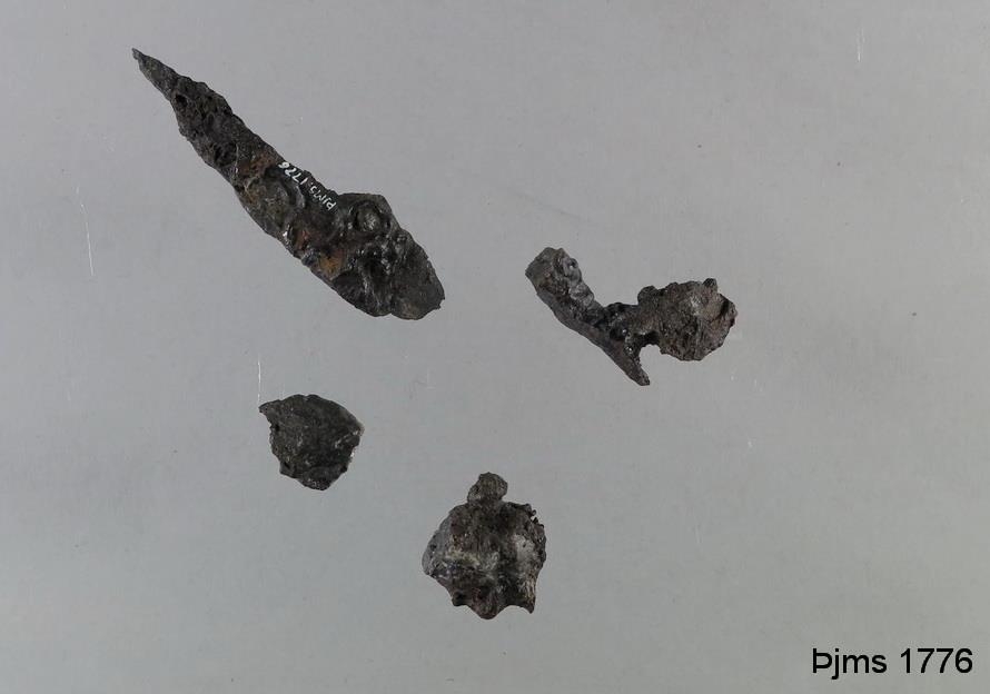 Járnbrot þrjú, óvíst úr hverju. Þyngd alls 85 gr. Um tvö þeirra sjá lýsingu Sig. Vigfss. í Árb. 1880-81, bls. 58. Þriðja brotið, hið minsta, kom 27/9 s.á. til safnsins frá sama manni og lýsir S.V. því svo í skýrslu safnsins: ,,Járnbútur lítill, og brotið af báðum endum; hann sýnist mjer vera úr nr. 3, sjá Brúarfundinn, en eingu er maður nær að heldur, að sjá hvað það hefur verið."1) 1) S.d. hefur ennfr. komið frá sama manni, samkv. skýrslu safnsins (S.V.): ,,Leifar af hnífblaði, tanginn og lítið eitt af blaðinu, mjög ryðgað. Þessir 3 hlutir (þ.e. brot af 1776 og 1778 auk hnífblaðsbrotsins) fundust síðar í moldum þeim sem bornar voru burt úr dysinni. Jeg held víst að þessi hlutur sje líka þar úr, því að leifar af hnífum hafa áður fundist hjer í fornum dysjum, sjá Hafurbjarnarstaða-fundinn; þar fundust beinkinnar af hníf og enda tvennar." - Ótölusett.