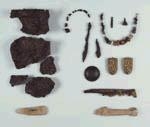 Vefskeiðarbrot úr hvalbeini tvö, handfang, l. 15,2 cm., og oddur, l. 11,5 cm., þ. 0,7 og br. mest 3,2 cm. Hnúðar eru aptast og fremst á handfanginu, líkir hjöltum og hefur vefskeiðin líkst mjög saxi, en er þetta nefnt ,,beinknífur" í skýrslu Sig. Vigf.s. í Árb. 1880-81, bls. 58, og í skýrslum safnsins, en slíkir beinhnífar eru allsendis óþektir fyr og síðar; vefjarskeiðar aptur á móti algengar í kvennadysjum frá þessu tímabili (sjá tilvitn. rit eptir Rygh S chetelig t. d.). - Sjálft handfangið, meðalkaflinn, hefur verið 8,2 cm. að l., 1,9 - 2,5 cm. að br. og 1,5 cm. að þ. Hversu löng vefskeið þessi hefur verið er allsendis óvíst, en hún virðist varla hafa verið lengri en 45-50 cm. Hún hefur verið svo sem hnífur að því leyti einnig að önnur röndin hefur verið þykk svo sem bakki, en hin eggmynduð. Hún hefur verið dálítið bogin, gerð úr rifi, og er henni hefur verið haldið í hægri hendi og oddurinn látinn beygjast að hefur bakkinn snúið upp. Hún virðist því ekki hafa verið ætluð til að slá með voð í vef, enda mun hún og hafa verið of lítil til þess, heldur mun hún hafa verið ætluð fyrir smávef og bandvefnað, þar sem slegið hefur verið að sjer , svo sem títt var í floslárunum er tíðkuðust nú á síðari öldum, sbr. nr. 991 og 1031; í honum er borðinn lárjettur og slegið að sjer. - Sömuleiðis var þessi vefjarskeið hentug í uppstandandi vef, ef slegið var niður, en ekki upp, en óvíst er hvort slíkir vefir hafa tíðkast hjer eða annars staðar á Norðurlöndum í fornöld.