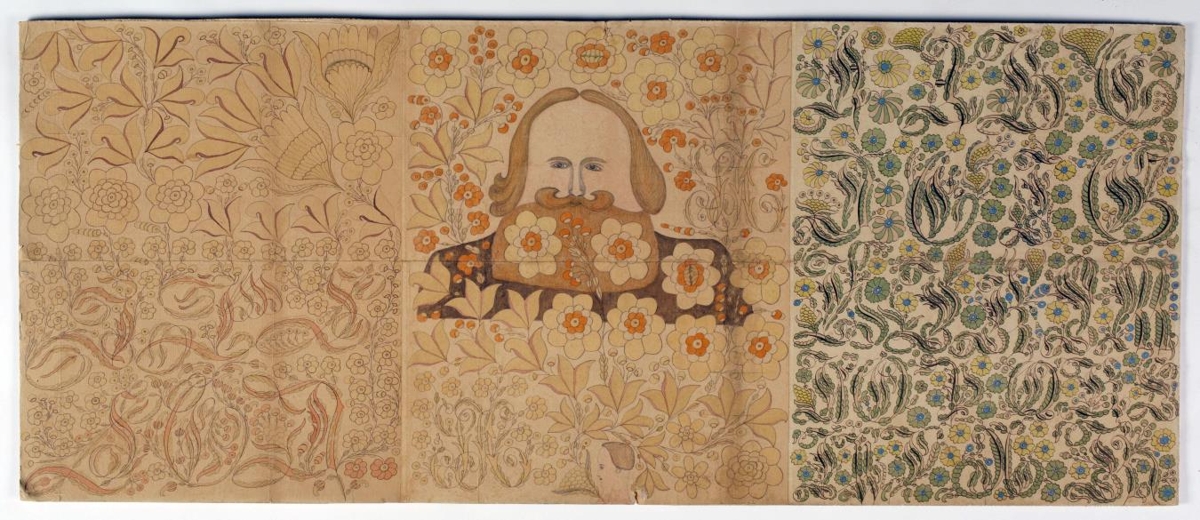 Uppdrættir eptir Sölva Helgason, 3, settir saman í eina umgjörð, st. 46 x 105 cm. að utanmáli, en breidd listans, sem hún er úr, er 2,5 cm. Hver uppdráttur fyllir heila pappírsörk og er gerður með ýmsum skrautlegum litum. Á hinum fremsta eru upphafsstafir hjóna og er mikið blómskraut um þá,: á þeim, sem er í miðju er mannsmynd og stafirnir S. og H. hjá á tveim stöðum, en allt í kringum myndina og þá er mikið blómskraut: sennilega tákna stafirnir S H, að myndin eigi að sýna Sölva Helgason sjálfan. Á aptasta uppdrættinum er stafrofið, mjög skrautlegir upphafsstafir. Allt er gert með töluverðri leikni og vandvirkni, en smekklaust og barnalega þó, eins og allt þess háttar eptir þennan mann.