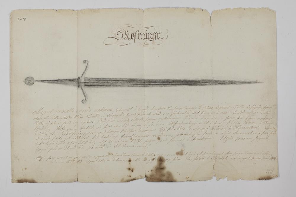 43. Sverðsmynd, á blaði; eins og í lýsingunni á blaðinu stendur, var sverð þetta 9. kvartil á lengð, og næstum 2 ½ þuml. á breidd, en að þýngð 3 * [pund] og 17. lóð, fyrir utan hið áttkantaða klót, eða hnúð aptan á því, það var tvíeggjað, fyrst fimkantað og svo fjórs kantað (hverjum megin) allt fram á odd, það var mjög begjanlegt, og tók sig aptur, þótt mjög riðgað væri. Þó var það hljóðgott, þegar því var slegið við. Sverð þetta fann gullsm. Tómás Tómásson, 1781, í sandskriðu, norðan Esjuberg. Ekki er kunnugt, svo eg viti, hvað af sverði þessu er orðið, þó er líkast, að það hafi verið latið til útlendra manna. Líka er óvíst, hvaða sverð það hefur verið, þó hjeldu margir, eða gátu til, að það væri Sköfnungur, er Hrolfur kraki bar, og Miðfjarðar-Skeggi sókti seinna í haug hans.