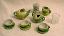 grænt og gult með ámáluðum laufblöðum. Ketill með loki, mjólkurkanna og