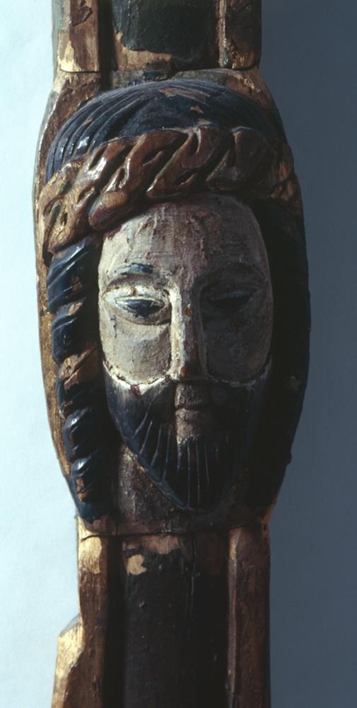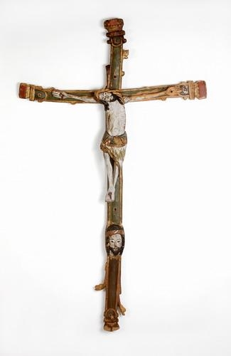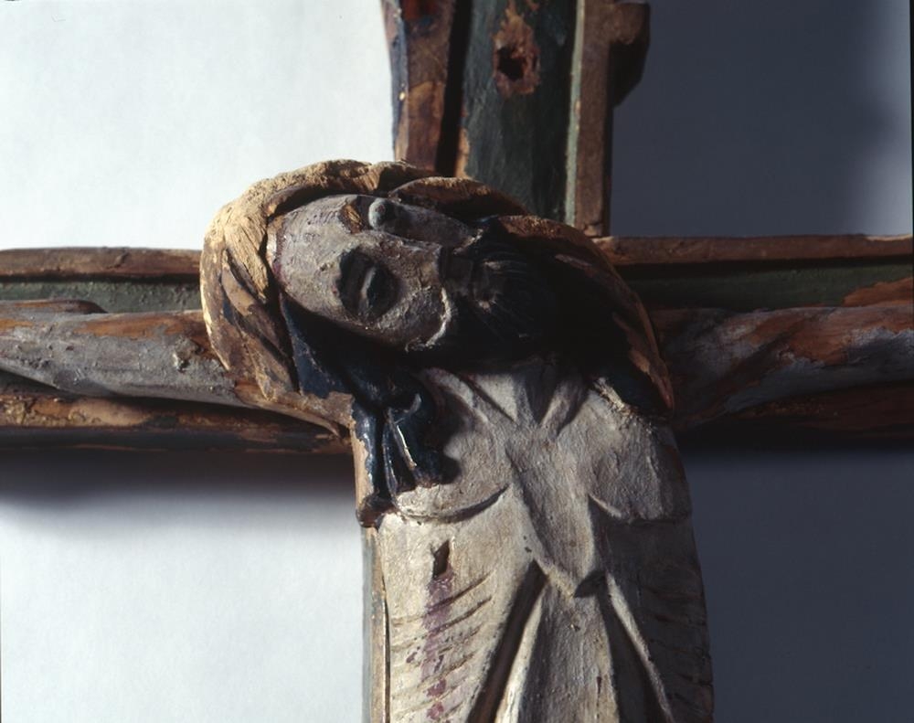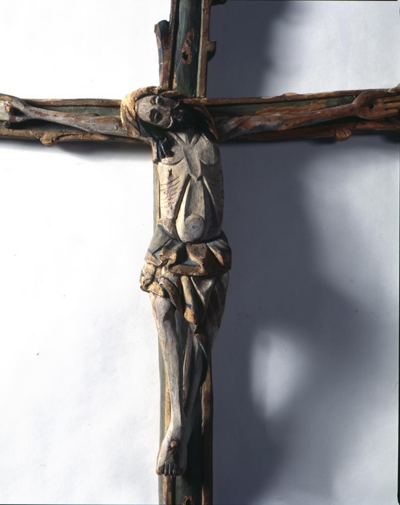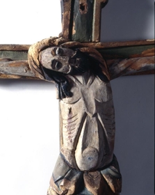Róðukross, smíðaður úr birki, íslenzkur. Krossinn er sjálfur útskorinn, einkum allir endar, með greinum útúr og málaður grænleitur, og gyltur frammeð röndunum og á endunum. Dálaglegt verk, en þó ekki alls kostar vandað. Langtrjeð er að l. 173,5 cm. og um 7,5-8,5 cm. að br. Þvertrjeð er að l. 102,5 cm. og víðast hvar um 7 cm. að br. Mynd Krists, róðan sjálf, er mjög illa skorin. Hún er um 62 cm. að hæð. Armar nær beint út. Höfuðið hallast útyfir hægra handlegg. Hægri fótur negldur yfir vinstri. Síðusár á hægri síðu. Mittisskýla mikil, máluð og gylt. Hár og skegg málað svart; hárið í snúnum lokkum og skeggið greitt. - Skamt fyrir neðan róðuna er fest framaná krossinn andliti útskornu, er og virðist vera andlit Krists, en er stærra en á róðunni, l. um 17 cm. Það er að sumu leyti líkt skorið og andlitið á róðunni; þyrnikranz, hár og skegg líkt, en öllu vandlegar skorið. Málning og annað verk á krossinum virðist nær óbreytt frá upphafi, nema hvað það er farið að hrörna alt. Hann er frá kirkjunni á Húsavík og líklega frá fyrri hluta 15. aldar.