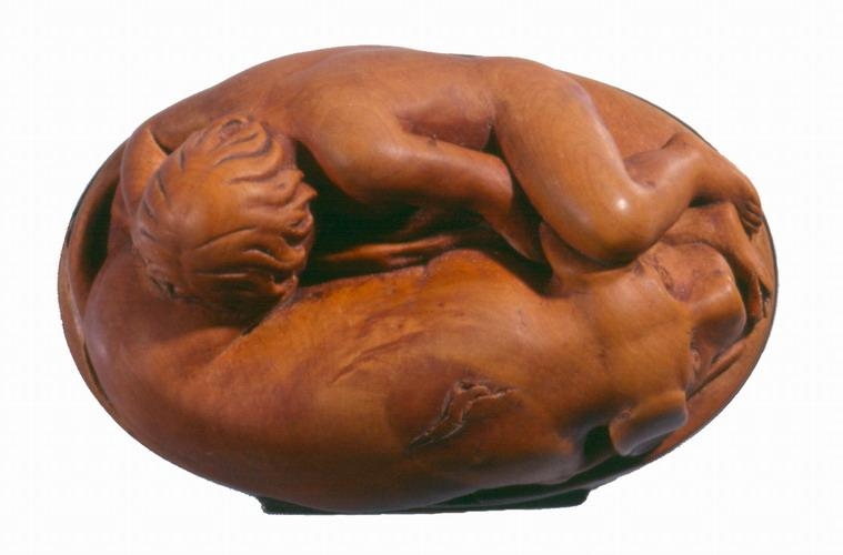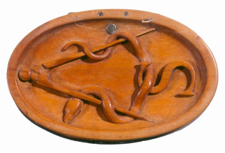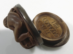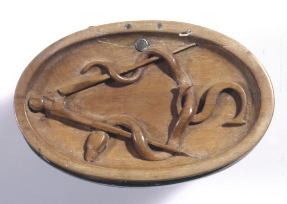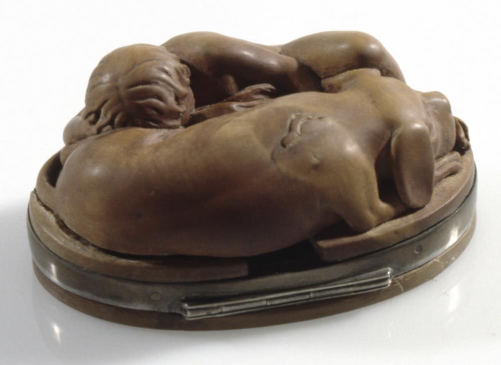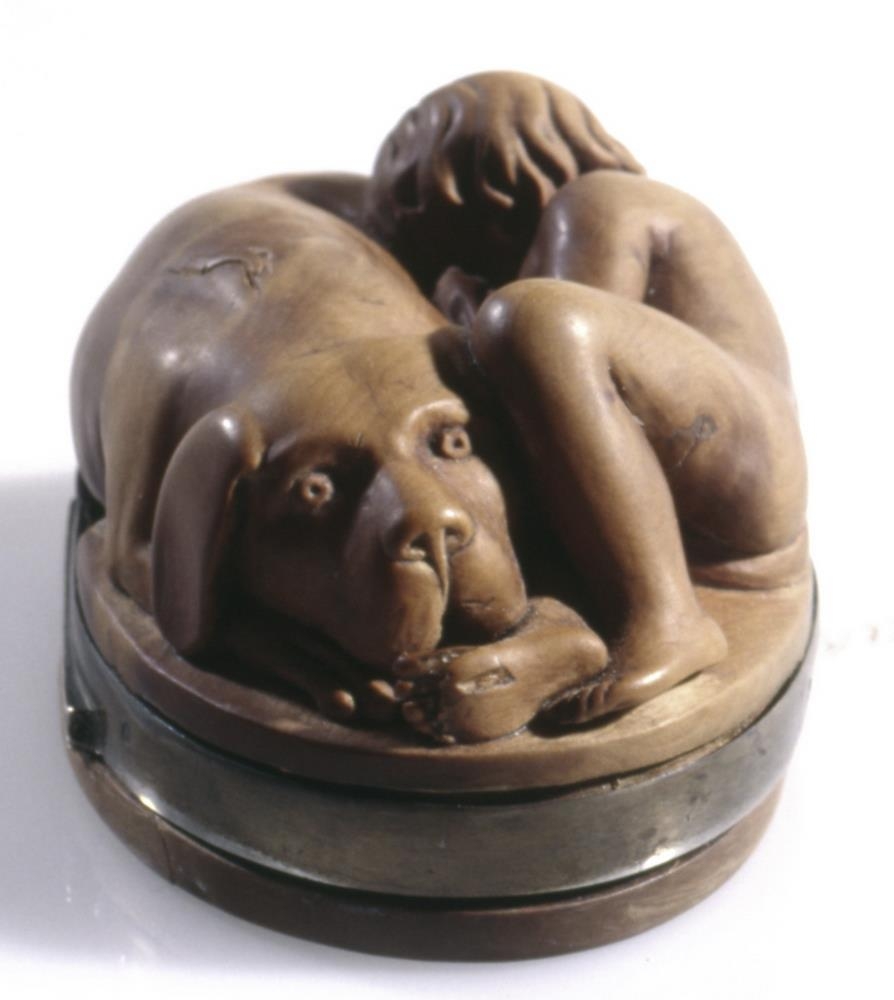 Dósir, útskornar úr rósviði eða líku trje, sporöskjulagaðar, 5,5-8,5 cm að þverm., 4,2 cm að h. mest. Ofaní lokið er skorin nokkurs konar skál og á botn hennar hátt upphleyptur hringfari, sem ormur hringar sig um tangana á, en þeir eru glenntir sundur. Á miðjan orminn, milli þeirra, er svo sem hengdur sje bokstafurinn S. Vafalaust upphafsstafur þess er dósirnar eru gerðar handa. Innaná lokinu er einnig skál og skorið á botn hennar : TIBI COMMODA MILLE. Lokið er flatt og er 1 cm að þ. mest. Það er fest með silfurhjörum við silfurgjörð, sem er um barmana á dósunum. Þegar þær eru lokaðar er lokið botn og snýr nú upp fallega útskorin mynd, mjög hátt upphleypt, af stórum hundi, sem liggur fram á lappir sínar, og ungum sveini, nöktum, sem liggur hjá honum og hefur vinstri apturfót hans undir höfði sjer og hægra armi, og grúfir sig að honum; en hundurinn horfir gætinn framundan sjer. Myndin er listavel gerð og af lærdómi, enda hefur Gunnlögur Guðbrandsson Briem gert dósirnar, þegar hann var við nám á Listaháskólanum í Kaupmannahöfn eða að því loknu. S-ið er líklega upphafsstafur nafnsins Stephensen.