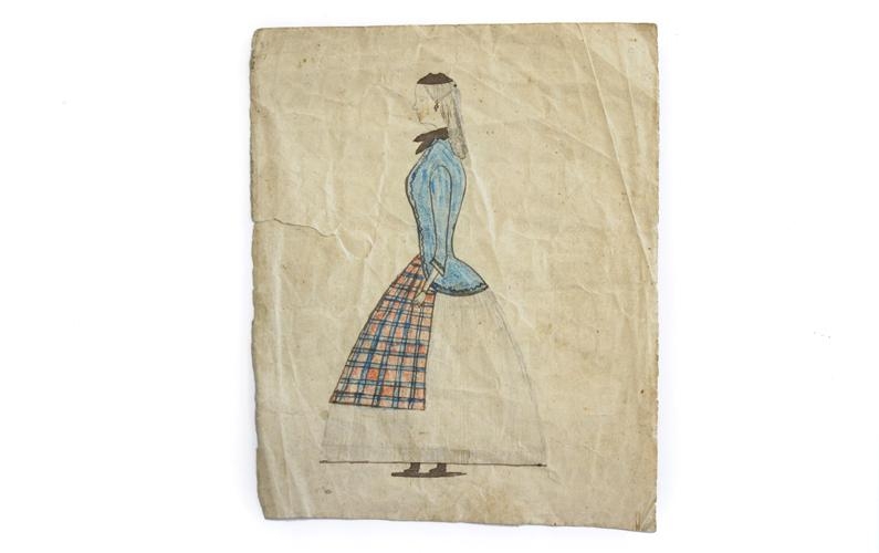 í peysufötum og sér á hlið stúlkunnar. Teikningin er gerð með blýanti en