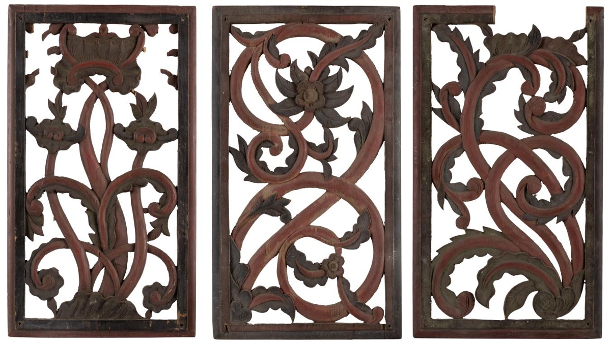 Skurðverk af prjedikunarstól ('9, 3 furufjalir ferhyrndar, l. 40,5 cm. (15 1/2). br. 23 cm. (9), þ. 1,2 - 1,6 cm.: þær eru allar með gagnskornu verki, strik hefluð umgjörð og jurtir með greinum og blöðum innaní. Alt skrautlega málað, leggir allir rauðir, en blöð og blóm eru græn og blá. Útskurður þessi er í skelstíl, en þó mun íklenzkt verk á þessu: líklega er það skorið og málað af Ámunda smið Jónssyni (d. 1805), sbr, t.d. nr. 3841.