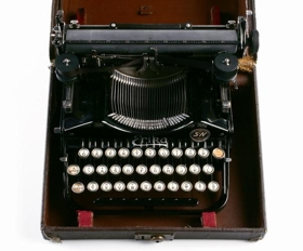 ritvélina árið 1927. Taskan er snjáð og mikið notuð en silfurplata, þar