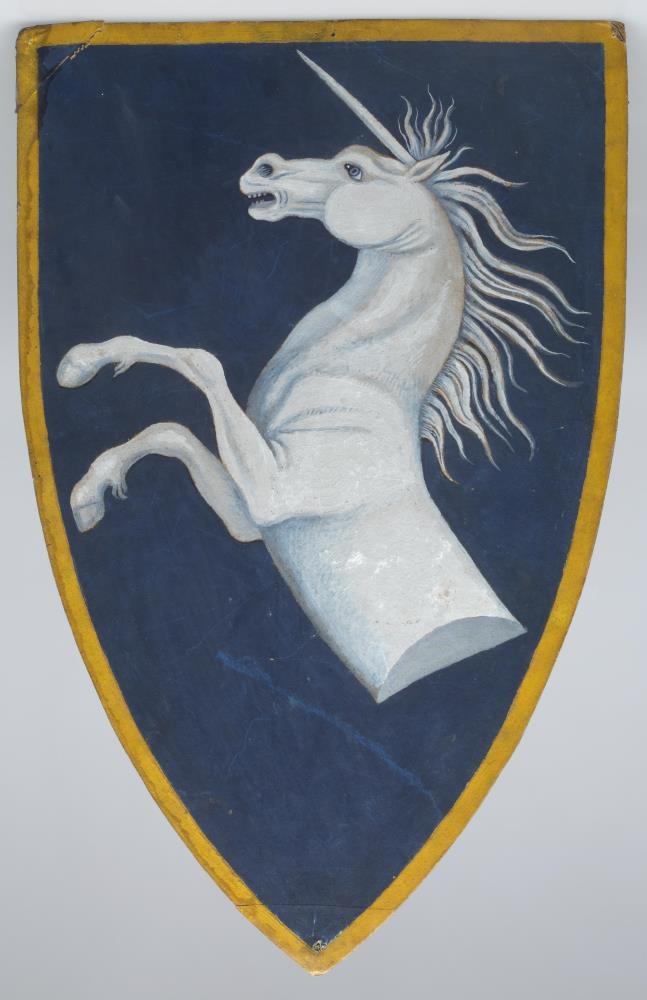 Blár grunnflötur með gulum skjaldarröndum. Á miðjum fletinum er frampartur af einhyrningi hvít - eða ljóslituðum. Framlappirnar eru í gangstöðu og faxið þyrlast frá makkanum en horn gengur fram úr honum. Einhyrningurinn vísar til vinstri.