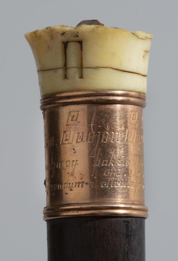 Göngustafur, með útskornum hún úr fílabeini eftir Ríkarð Jónsson, myndhöggvara, og stöng úr íbenholti. Húnninn er íboginn með stétt að aftan, 12 cm að lengd milli enda, ekki alveg sívalur, þvermál 2,1 og 2 cm. Kringum stéttina er skorin hlekkjafesti og aftan á hana skip á siglingu í öldóttum sjó. Áttablaða rós er skorin á hvora hlið og lína eins og snúinn strengur með þremur slaufum á eftir endilöngu. Framan á ..... eru skornir stafirnir GG. Neðst undir bugnum er fangamark smiðsins R.J. Efst á stönginni er gullhólkur 2,3 cm að breidd, með mjóum, tvöföldum bryggjum að ofan og neðan og stimpli "JJ 14K". Á hann er grafinn áletrunin: "Alþm. Guðjón Guðlaugsson / Kveðja og þakkir frá vinum og / kjósendum í Hrútafirði."