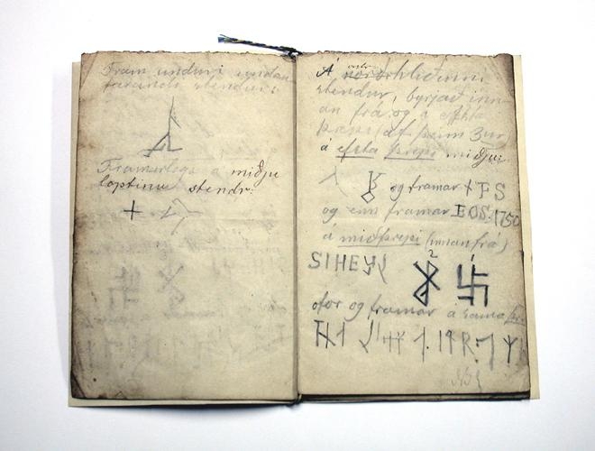 blaði stendur: Isländsk handskrift. Teikningarnar af rúnunum og