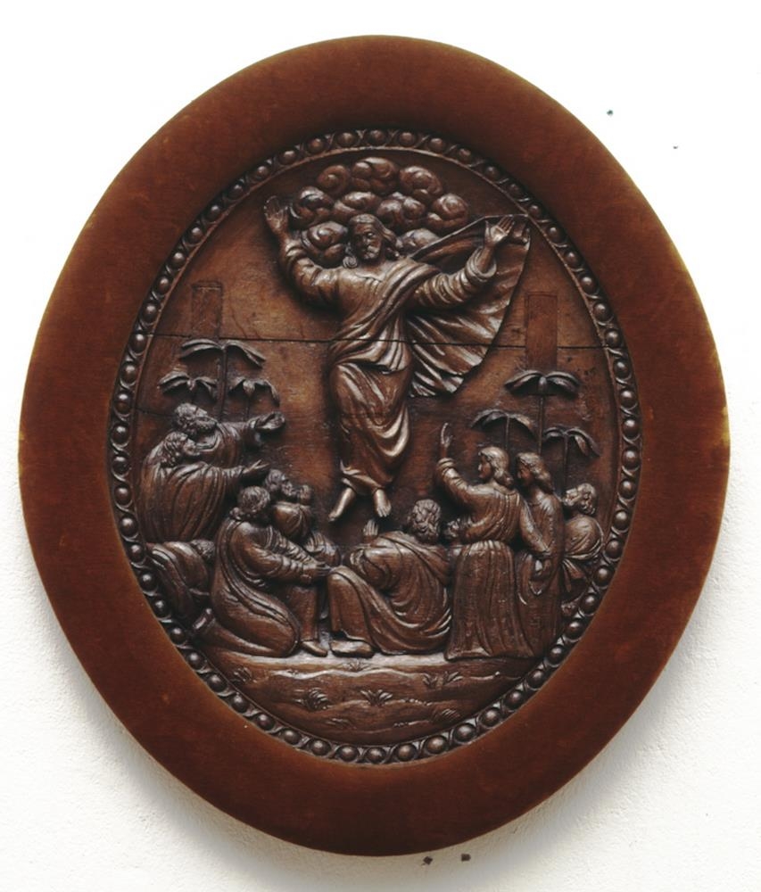 Úr aðfangabók: Altaristafla, skorin úr eik, sporbaugslöguð, 79,5 cm að hæð, 65 að breidd og 4 cm að þykkt. Taflan er ágætt verk og sýnir himnaför Jesú. Ofantil í miðju svífur Kristur í loftinu með útbreiddan faðm og upplyftar hendur, skikkjan flögrar í kringum hann eins og vængir, uppi yfir höfði hans sjást nokkrir skýhnoðrar, að neðan krjúpa postularnir á hné með framréttar hendur. Taflan er nú ljósbrún-lökkuð og utan um hana er nýleg umgerð úr furu yfirdregin með brúnu flöjeli, 10 cm að breidd og 5 cm að þykkt. Talið er að C.B.Hansen í Kaupmannahöfn hafi gert við töfluna rétt áður en hún kom hingað í safnið. Skáldað í tré (sýningarskrá): Þekktasta verk Guðmundar Pálssonar (Guðmundar bílds) er líklega umgerðin um alabastursbríkina fornu í Þingeyrarkirkju. Yfir henni er bogalaga skrautmáluð mynd af himnaför Jesú, næsta lík mynd af himnaförinni, sem er í Þjóðmjasafni (Víd.3). (Sigrún Blöndal, 10.1.2011) Churches in Iceland, p. 304: Carved wooden bas-relief of the Ascension of Christ by woodcarver Guðmundur Pálsson (1830-1884). (sbl, 6.5.2011)