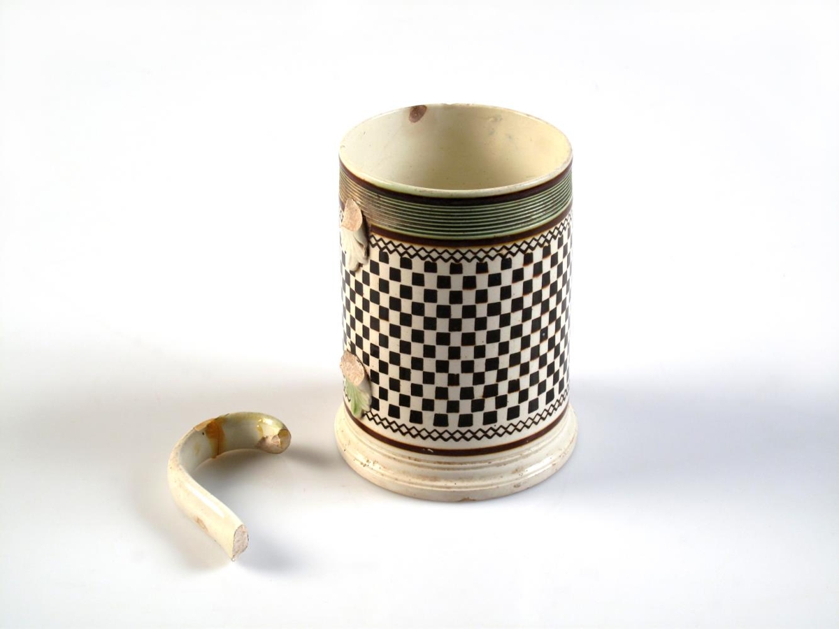 brúnu og grænu munstri. Handfangið (eyrað) er brotið af en fylgir með.