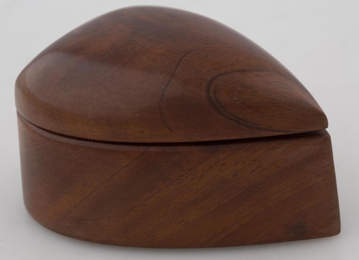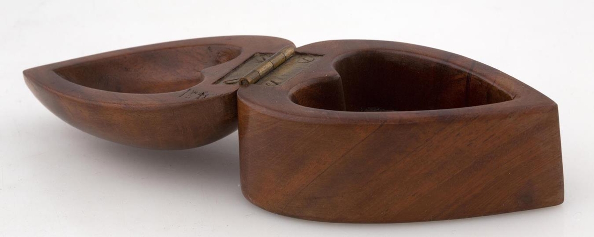 Askja með loki á hjörum, smíðuð af gefanda, úr mahogný; er hjartalöguð, lokið kúpt; 10 cm að lengd, 7 cm að breidd (mest) og 5,7 að hæð.