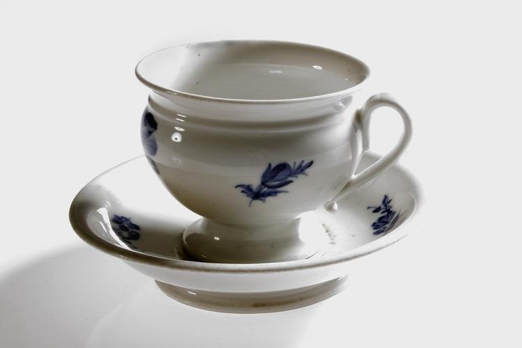 postulíni, hvítt með bláum rósum; bollinn er víðastur um barmana, annars