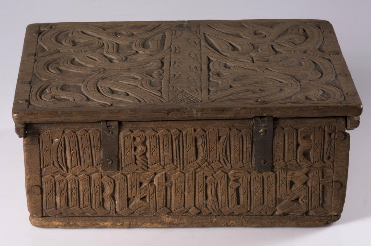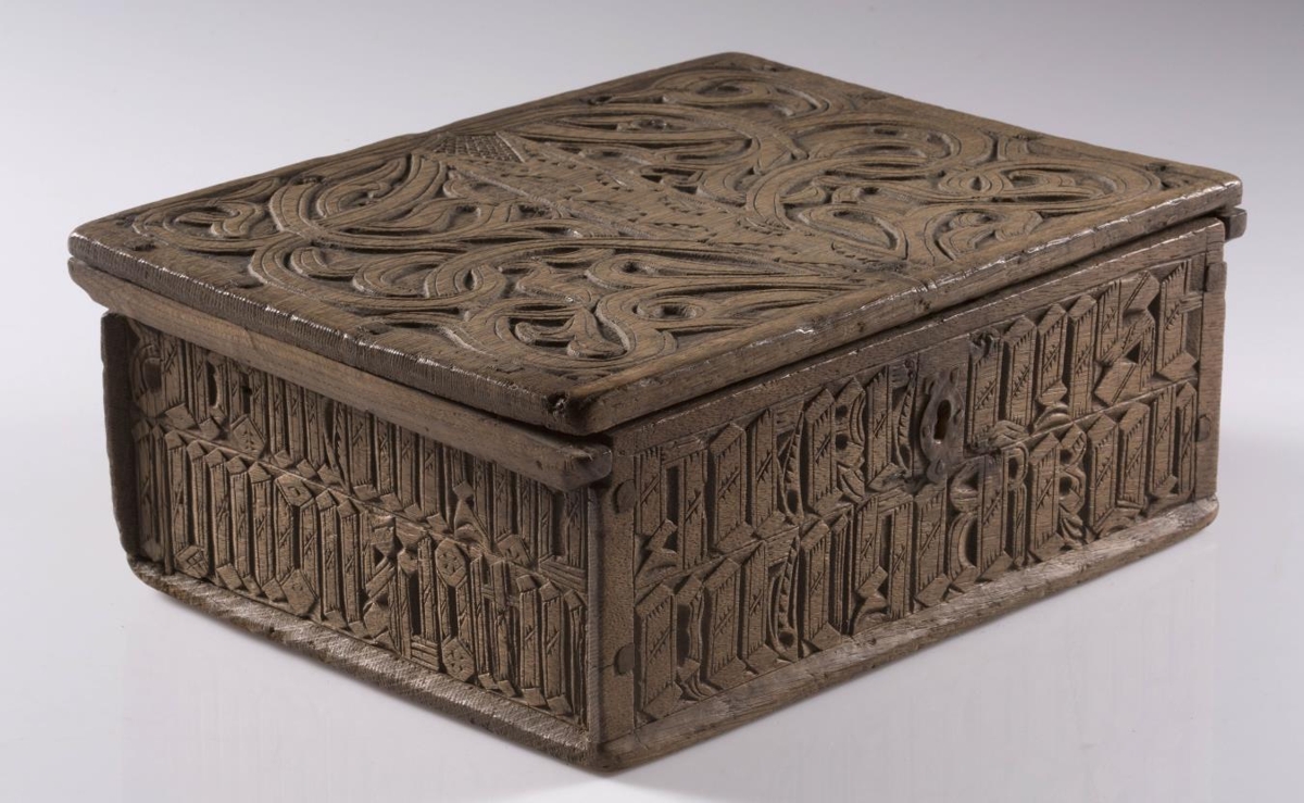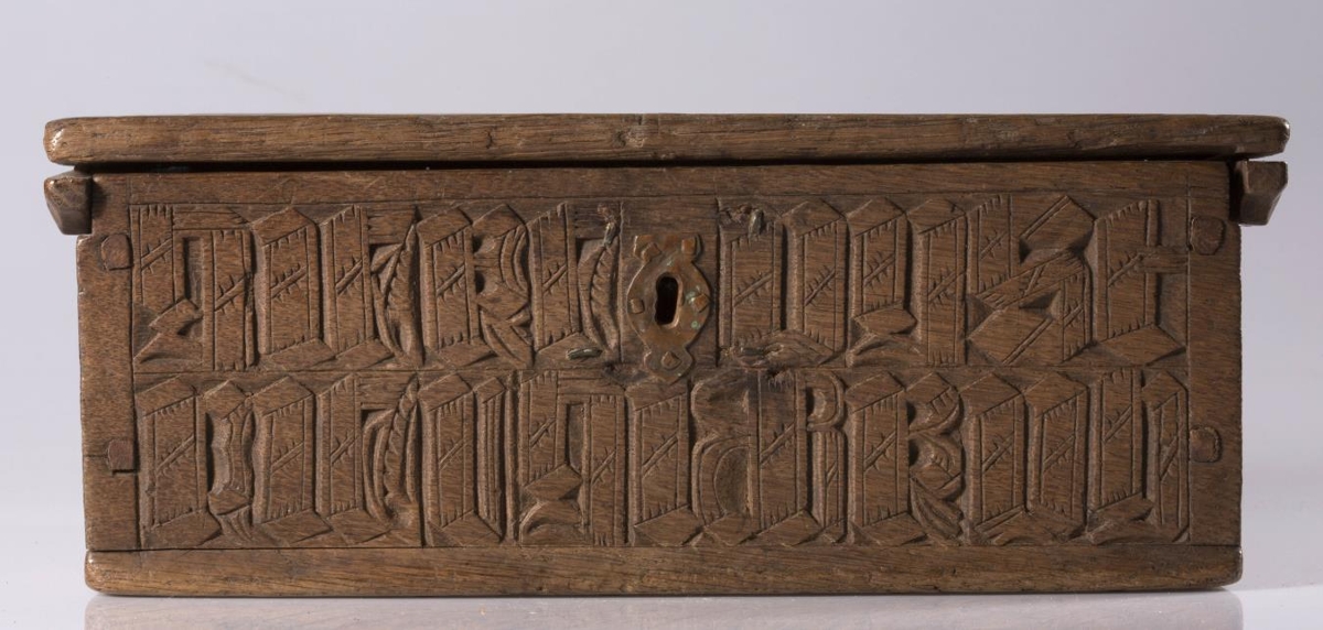 Kistill. Efni eik. L. 31,3, br. 24,2, h. u. l. 11,5 cm. Lamir, skrá og skráarlauf úr eiri. Negldur saman með trjenöglum. Á lokinu eru útskornar greinar, flatar og lágar. Á hliðum og göflum eru 2 höfðaleturslínur og er sú áletrun þannig: giefe vyst - þier giæfvh - aagvdafh - ædvm... ............. gud-runionsdottir. Sennilega frá fyrri hluta 18 alda.