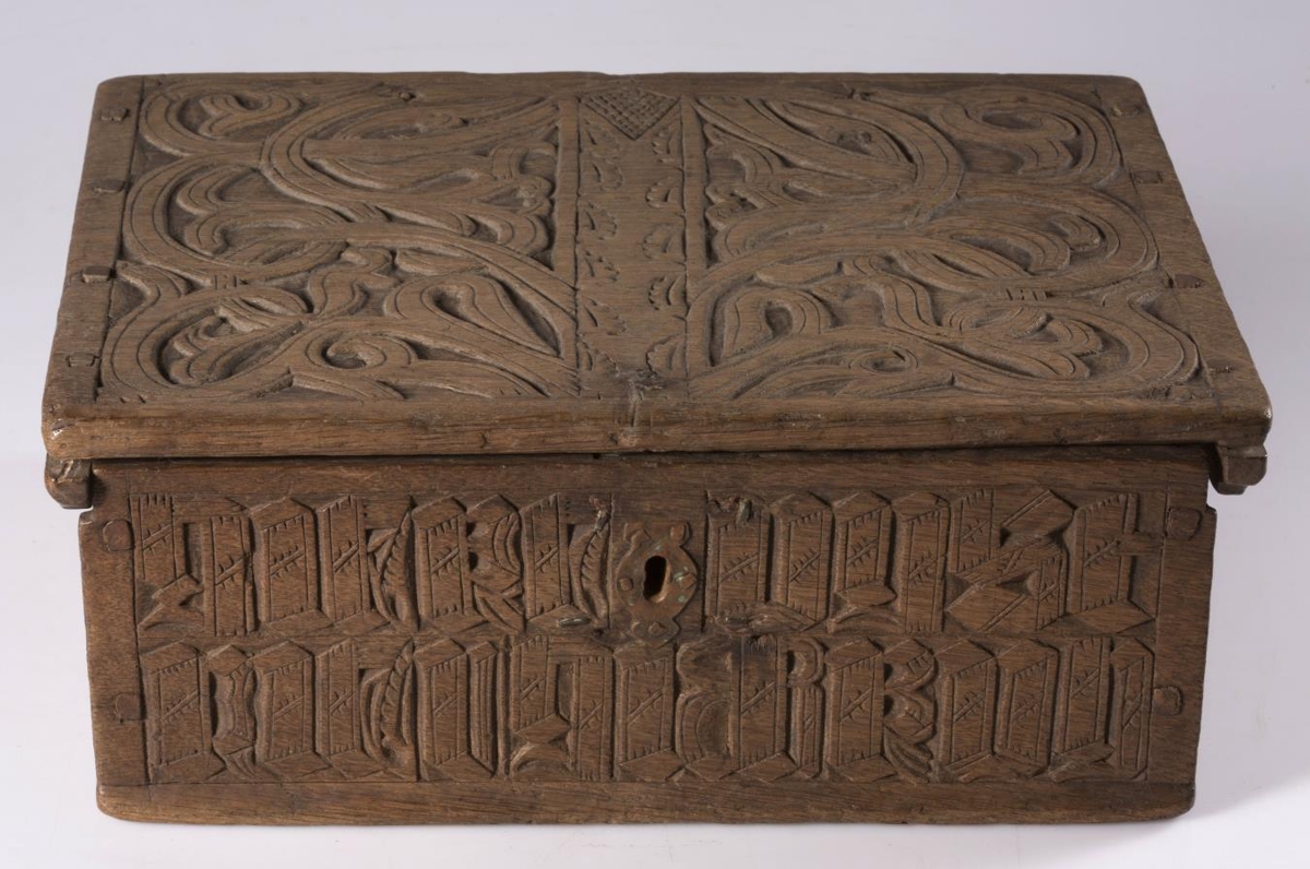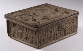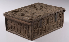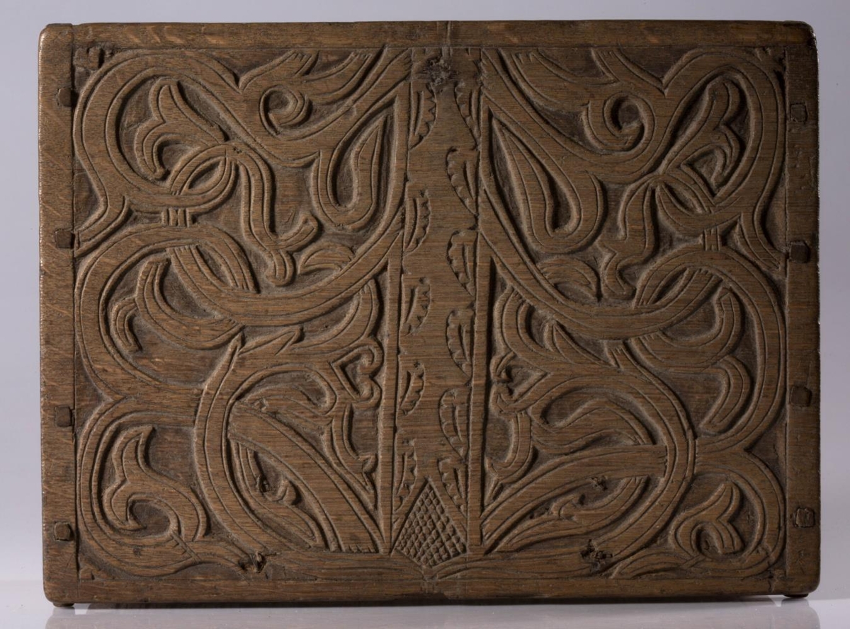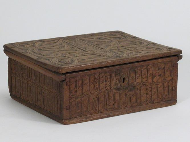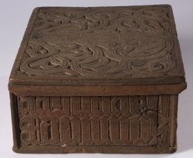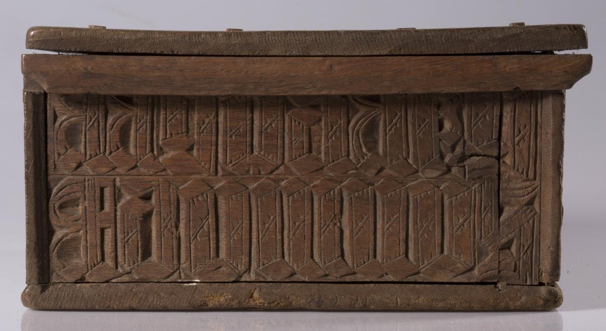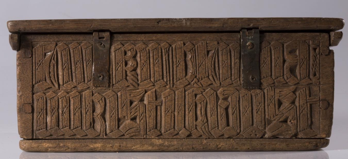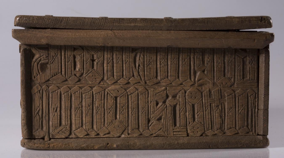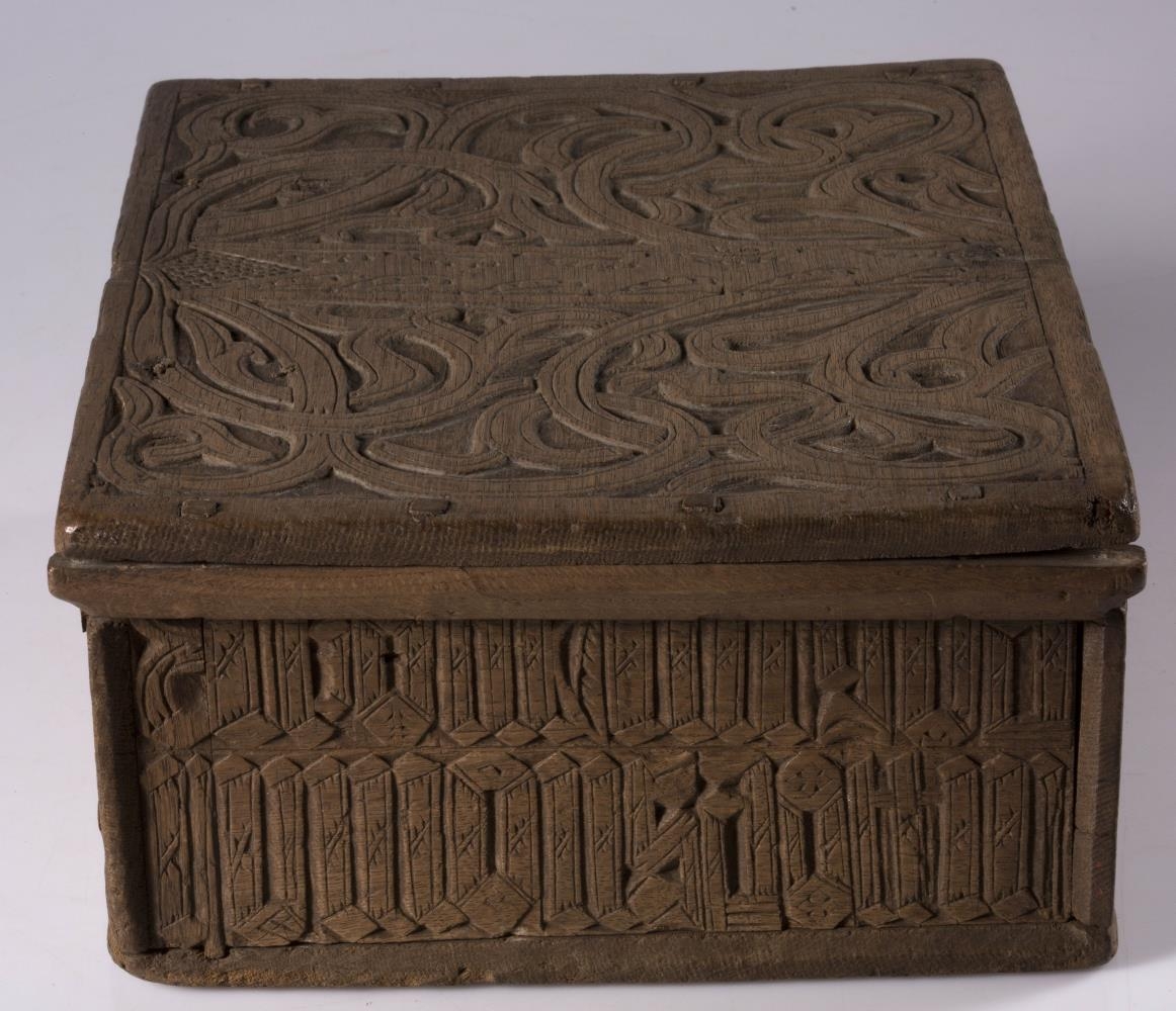3. Útskurður á hliðum, göflum og loki. Tvær höfðaleturslínur eru á hliðunum og göflunum. Á lokinu er dálítið grautarlegt stöngulskrautverk. Stönglarnir ganga út frá lóðréttum miðstofni, um 4.5 sm breiðum, með innri útlínum og innskorin blöð meðfram þeim að innanverðu. Efst er stofninn skreyttur með ferhyrndum, rúðustrikuðum reit. Breidd stönglanna er mjög breytileg, mest milli 1 og 2 sm. Þeir eru flatir að ofan með innri útlínum, mynda króka, fléttast saman, enda flestir með tveimur blöðum, sem minna á fisksporða. Hið upphleypta er um 2 mm hátt. - Skrautverkið ekki sérlega hrífandi. Bókstafirnir eru miklu fínna verk.