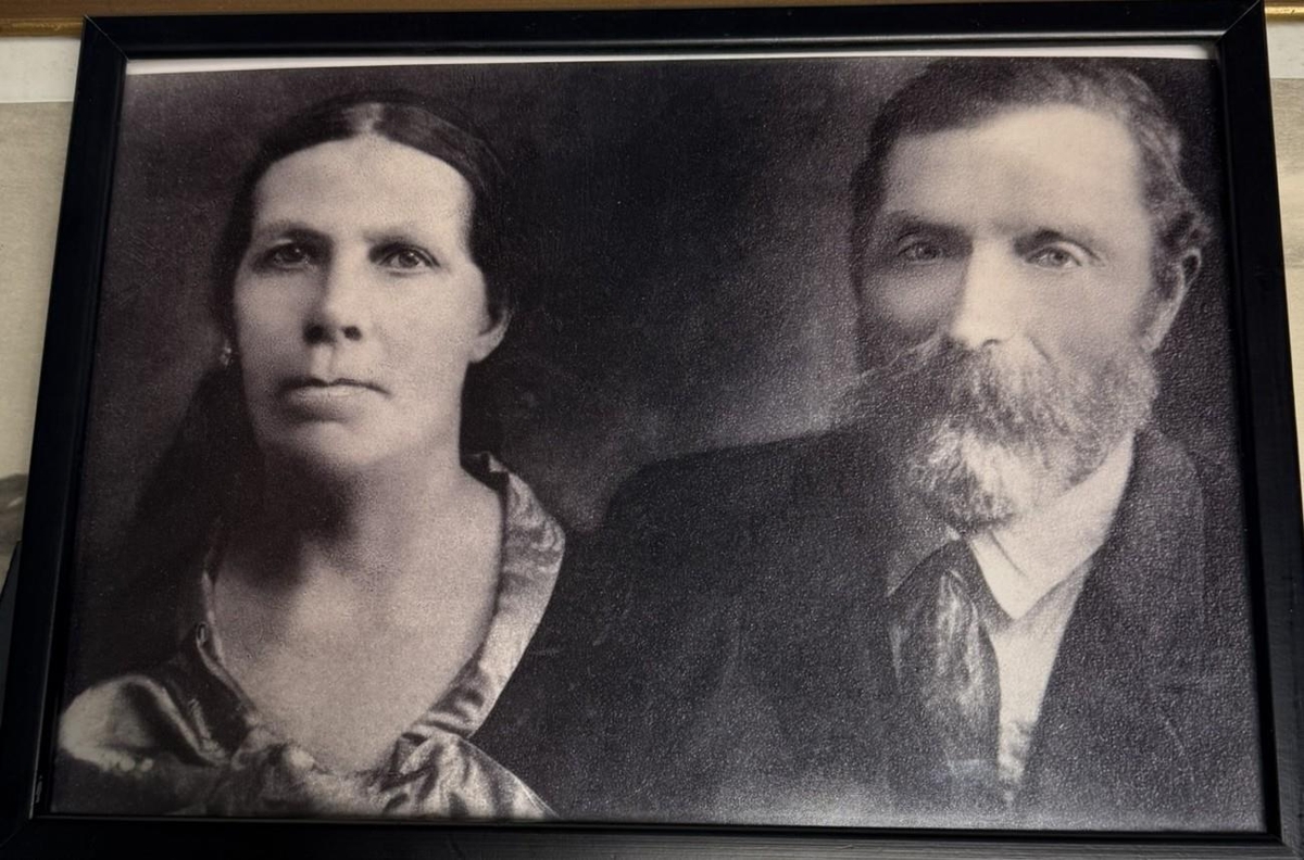 Stækkuð ljósmynd og innrömmuð. Er af afa og ömmu biskups, Sigurbergi Einarssyni (1862-1947) og Árnýju Eiríksdóttur (1862-1956)