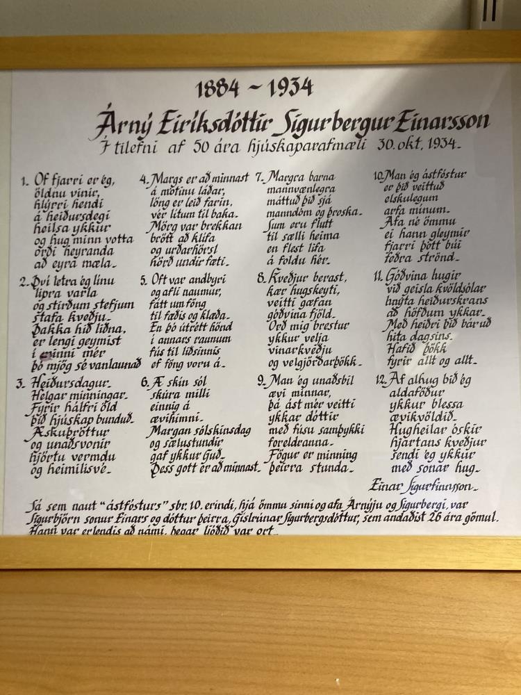 Skrautletrað og innrammað heiðursljóð Einars Sigurfinnssonar til tengdaforeldra sinna 1934 í tilefni 50 ára brúðkaupsafmælis þeirra. Stærð 53,5 x 43,5 cm.