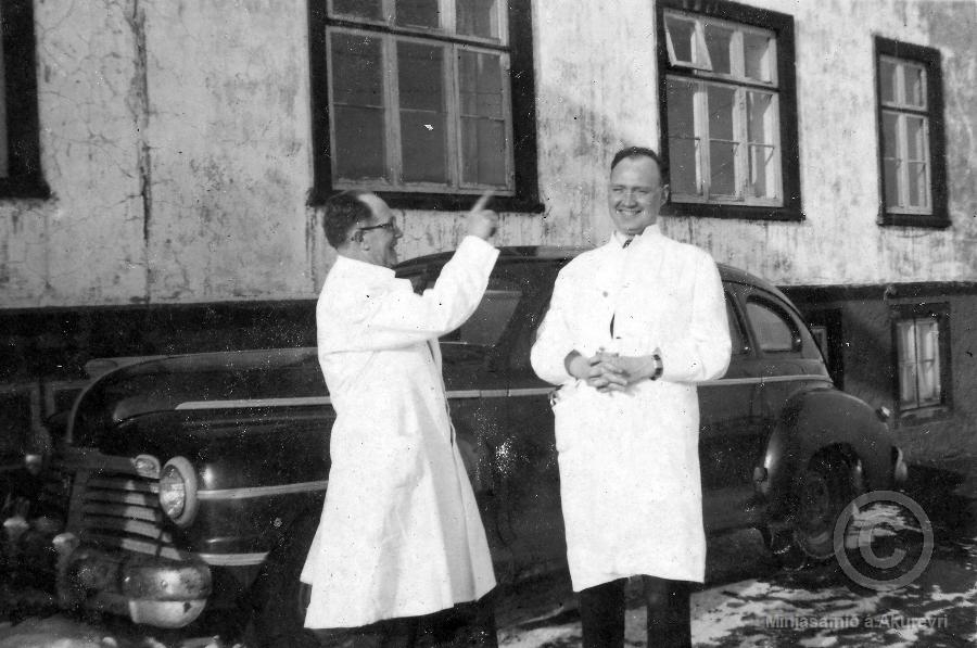 Læknarnir Árni Guðmundsson og Bjarni Rafnar á góðri stundu austan við sjúkrahúsið á Akureyri.