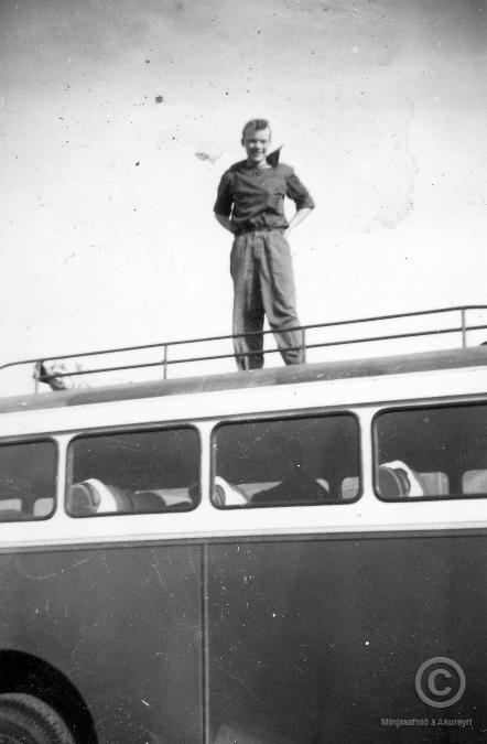 Óðinn Valdimarsson stendur uppi á þaki á rútu.