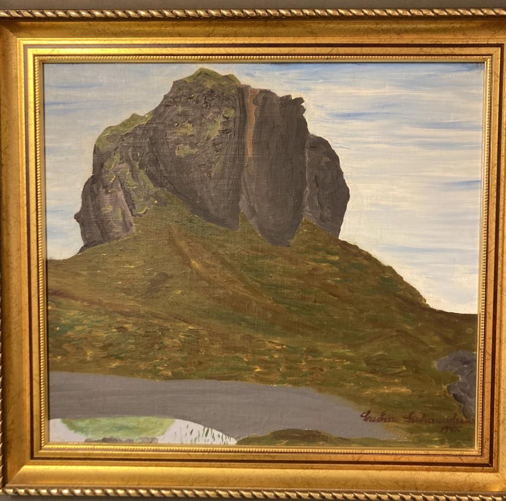 Lítið olíumálverk af Systrastapa, óinnrammað, 34x38 cm. Er málað á ´masonit.´ Merkt Guðm. Guðmundsson 1945. Þetta er hinn víðfrægi Erró og víst eittt af hans elstu verkum. Hann er fæddur 1932 og því aðeins 13 ára er myndin er máluð. Gefandi málverksins, Auður H. Winnan, hefur verið búsett í New-York í 50 ár.