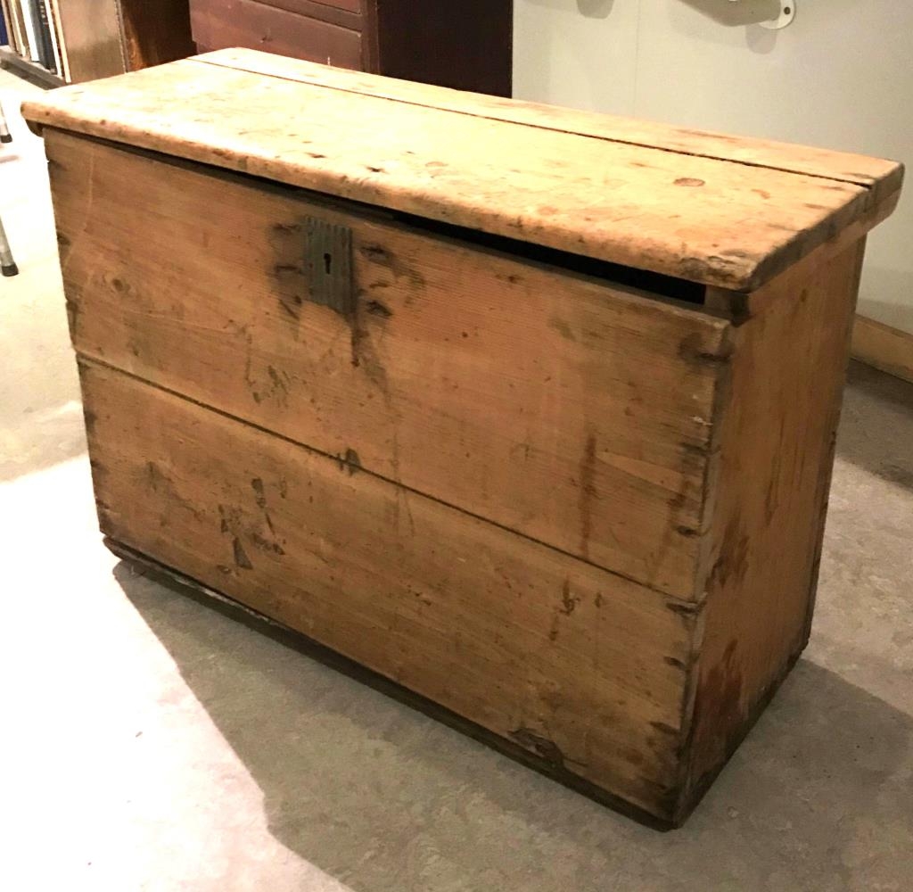 Skrína, smíðuð úr furu. Framhlið 63x45 cm, breidd 27 cm. Vart mjög gömul, járnnegld ekki geirnegld. Með nokkurri vansmíði.