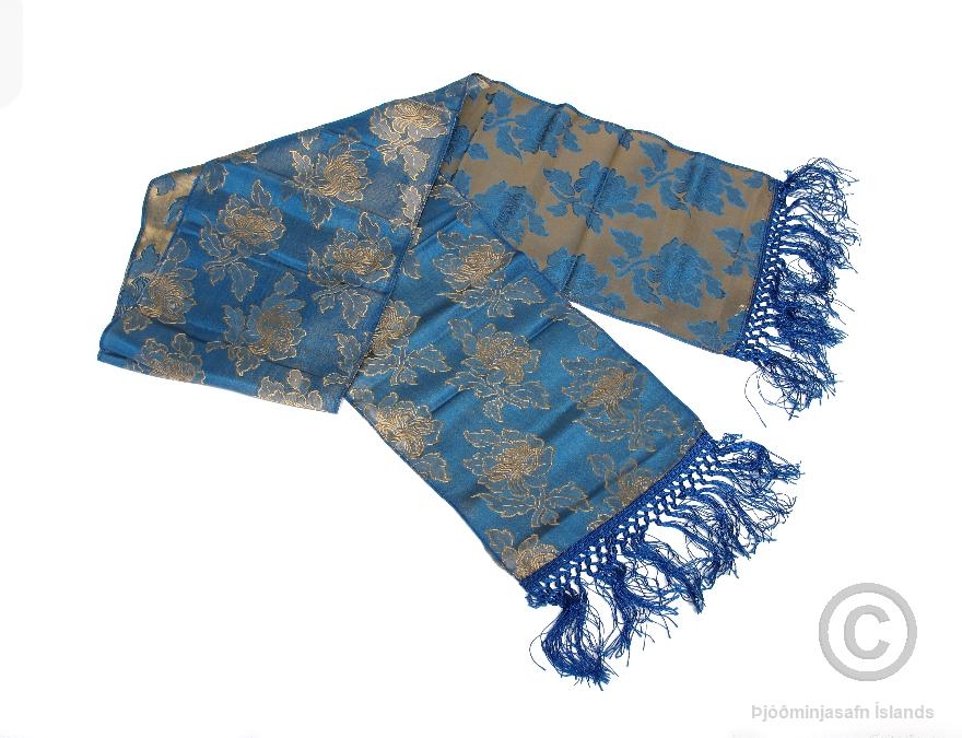 Peysufataslifsi úr rósofnu silkidamaski, bláu og gylltu, með bláu kögri á endum. Slifsið er um 176 cm langt, mælt með kögri, og 21 cm breitt. Það er í mjög góðu ástandi. Slifsið er úr eigu Elínar Ólafar Ólafsdóttur (f. 1901, d. 1954), sem alla tíð bjó á Blómsturvöllum í Fljótshverfi.