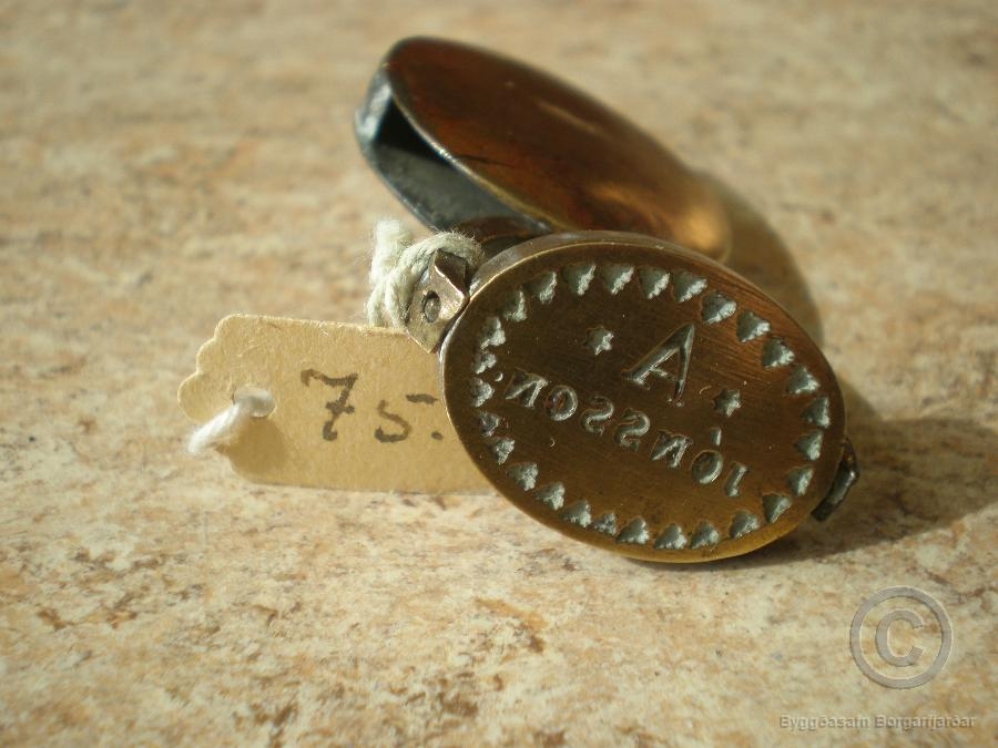 Signetið ber áletrunina A. Jónsson á annarri hlið, en A.J.S. á hinni. Eirlitaður málmur. Arni (eins og hannskrifaði sjálfur nafnið sitt) Jónsson, Ásgarði (Hvanneyri), Borgarfirði,stjúpafi gefanda átti innsiglið. Kona hans var Sigríður Jónsdóttir og trúlega hefur sú hlið signetsins, sem ber stafina A.J.S., verið notuð á bréf frá þeim hjónum báðum.